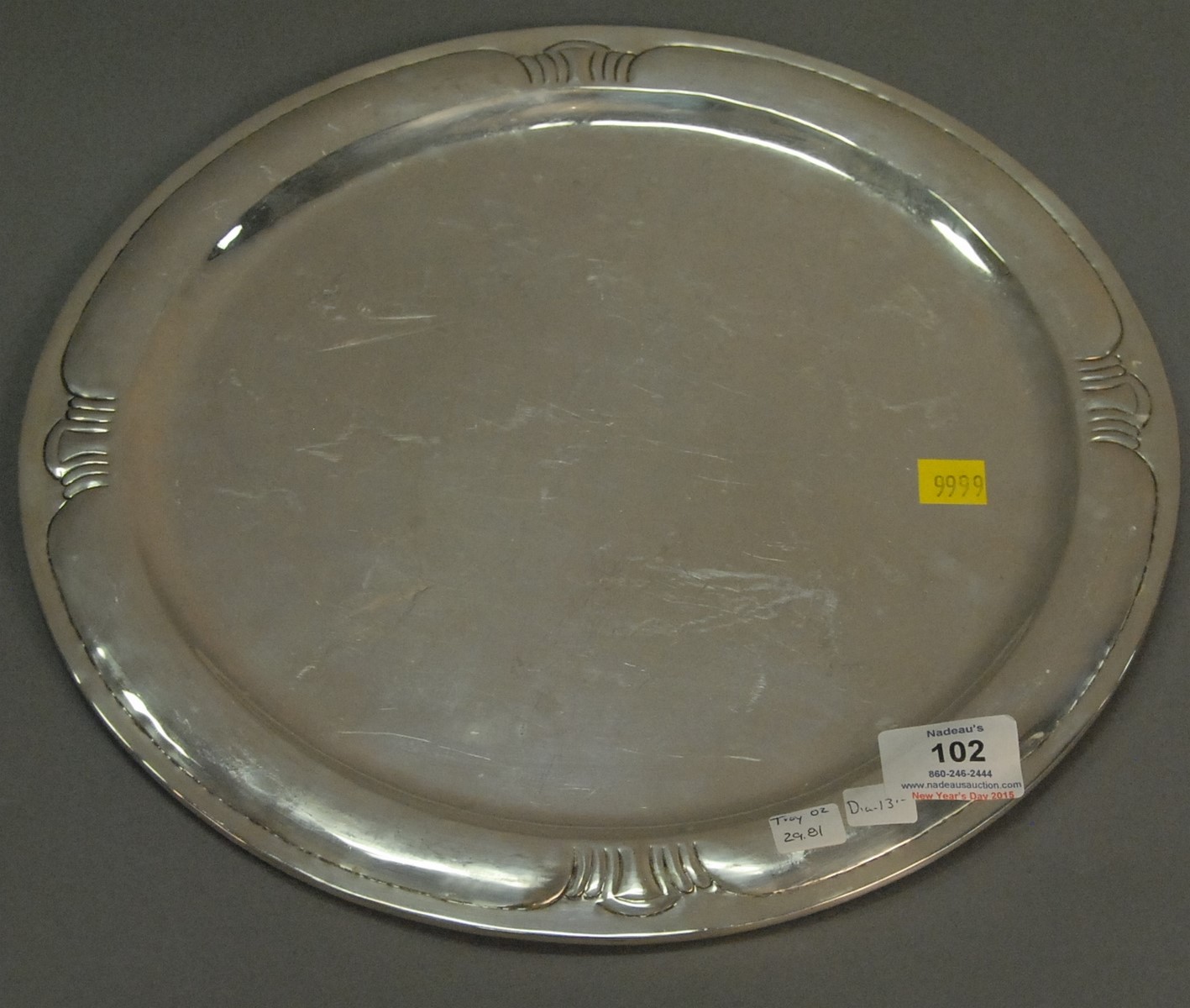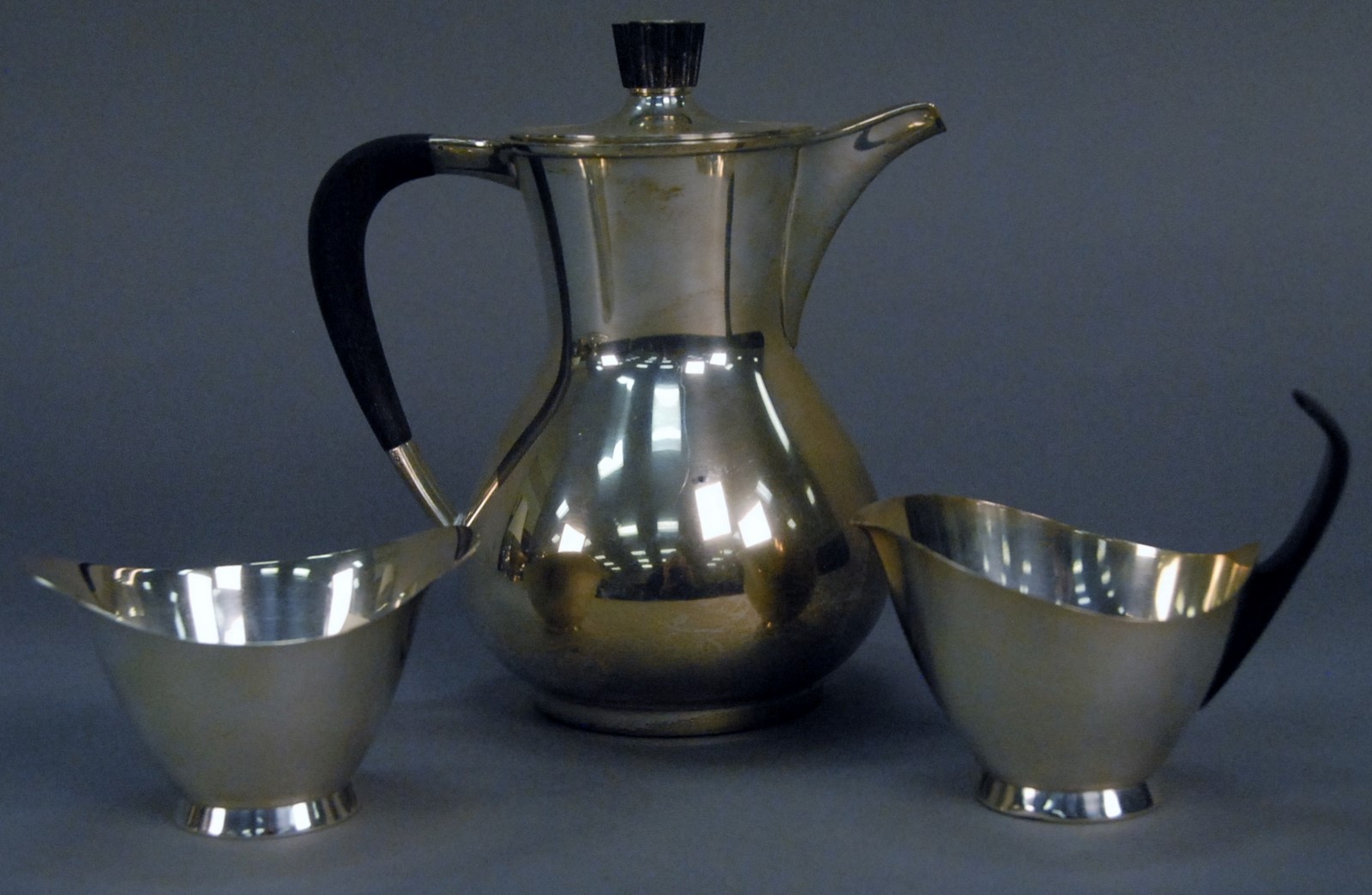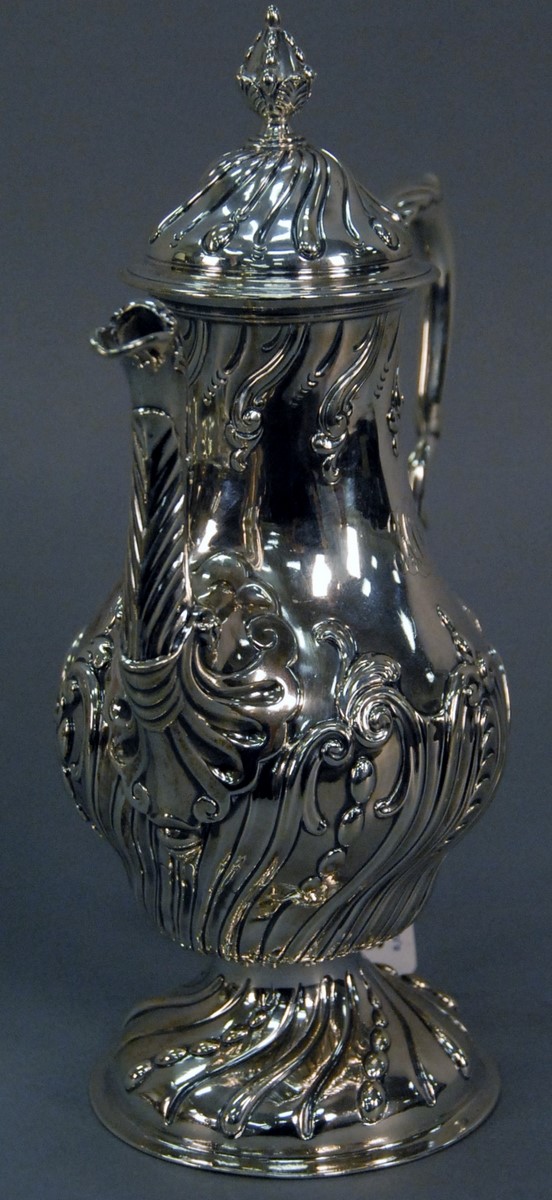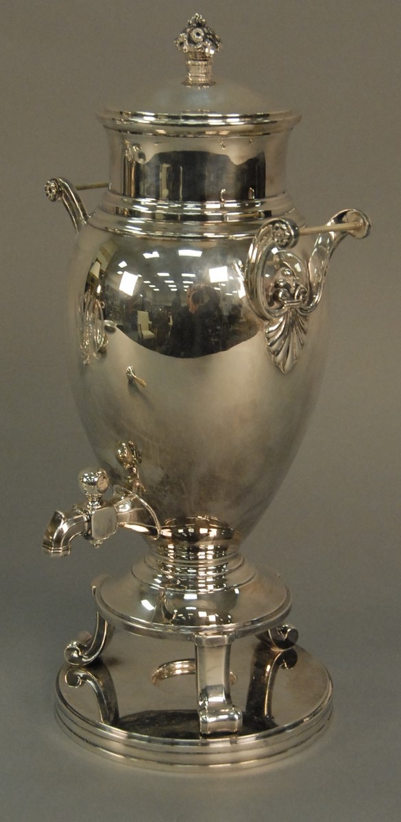 Sterling silver hot water pot with warmer and spigot, marked Grogan Co. Pittsburgh Sterling France four ivory handles missing. ht. 14 in. 88 total t oz.