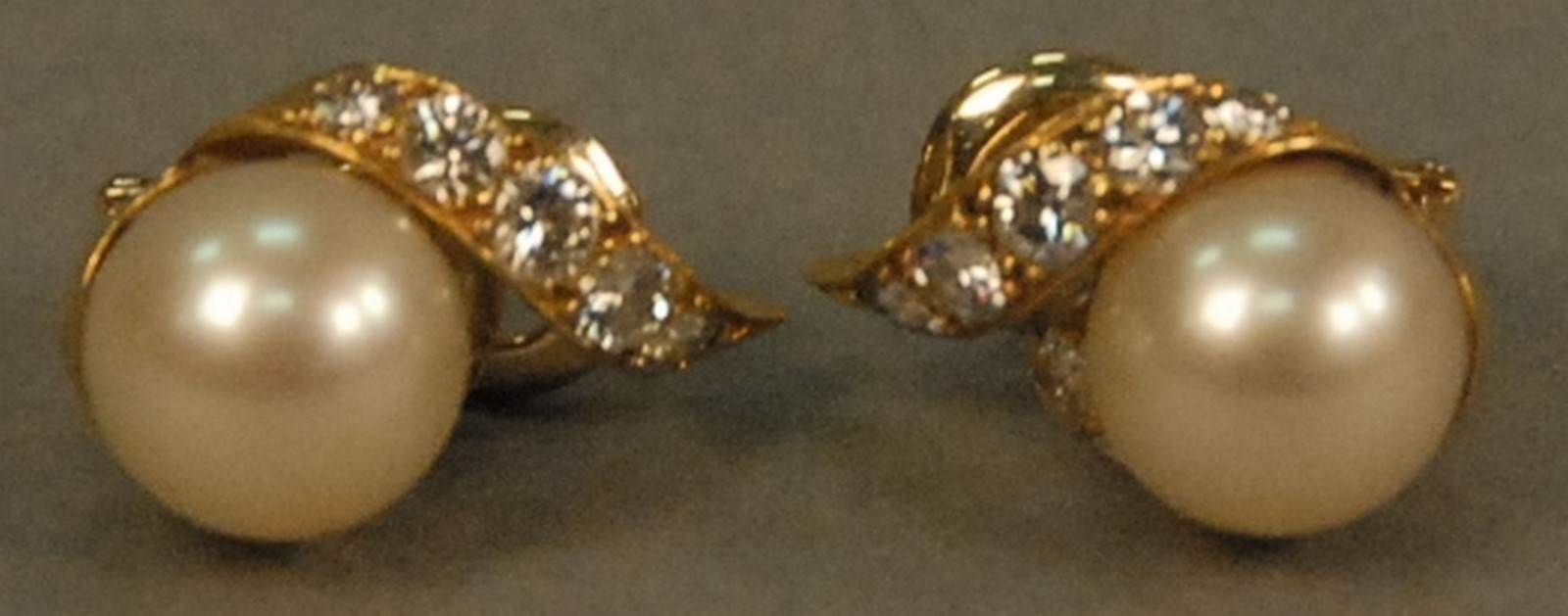 Van Cleef & Arpels 18K yellow gold cultured pearl and diamond clip on earrings, each having eight diamonds. Provenance: Property from The Estate of Margaret Reventlow of Litchfield, CT