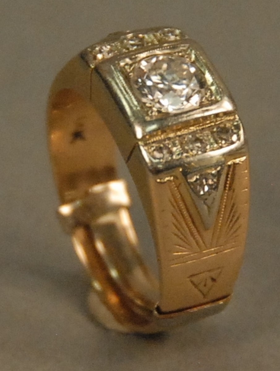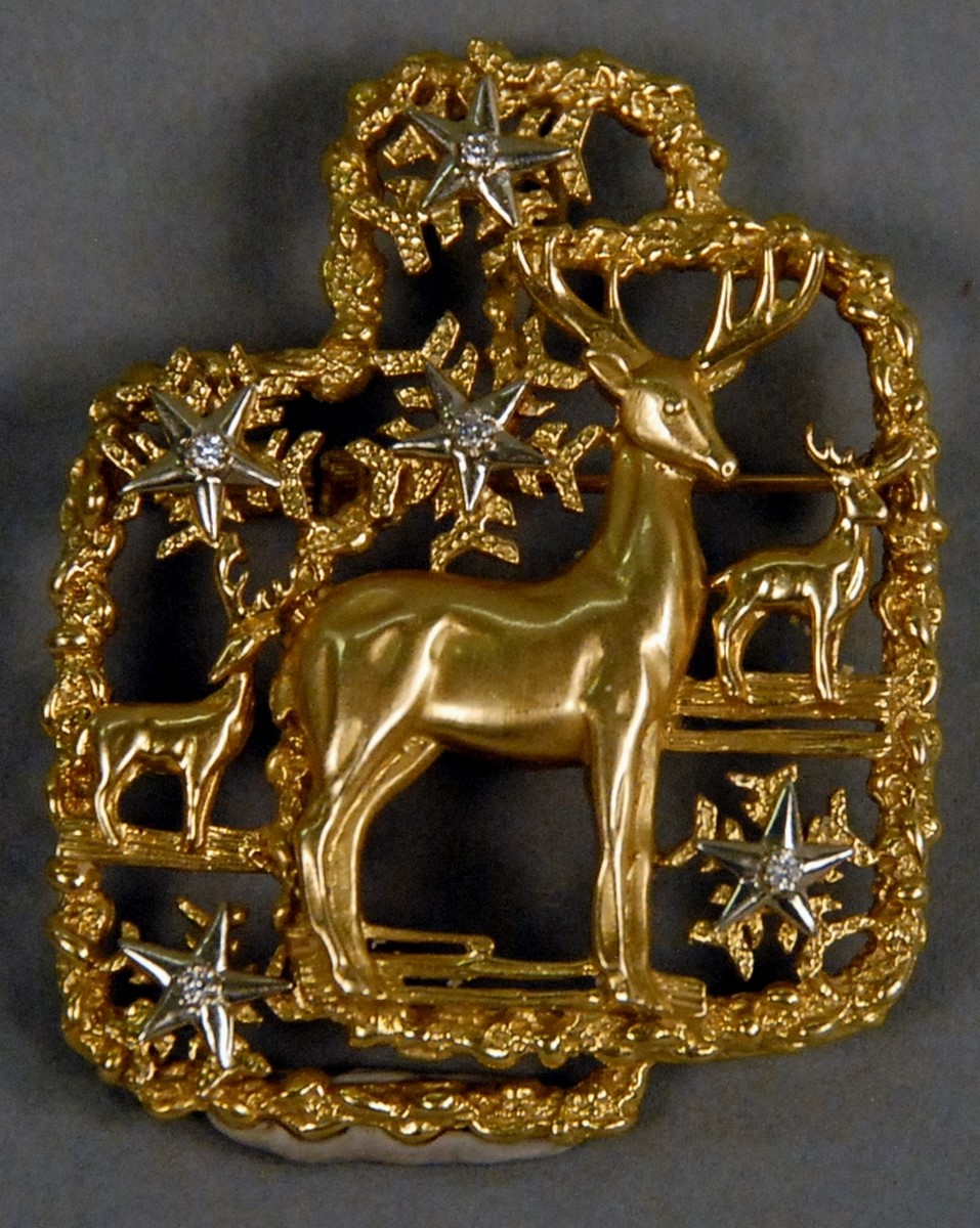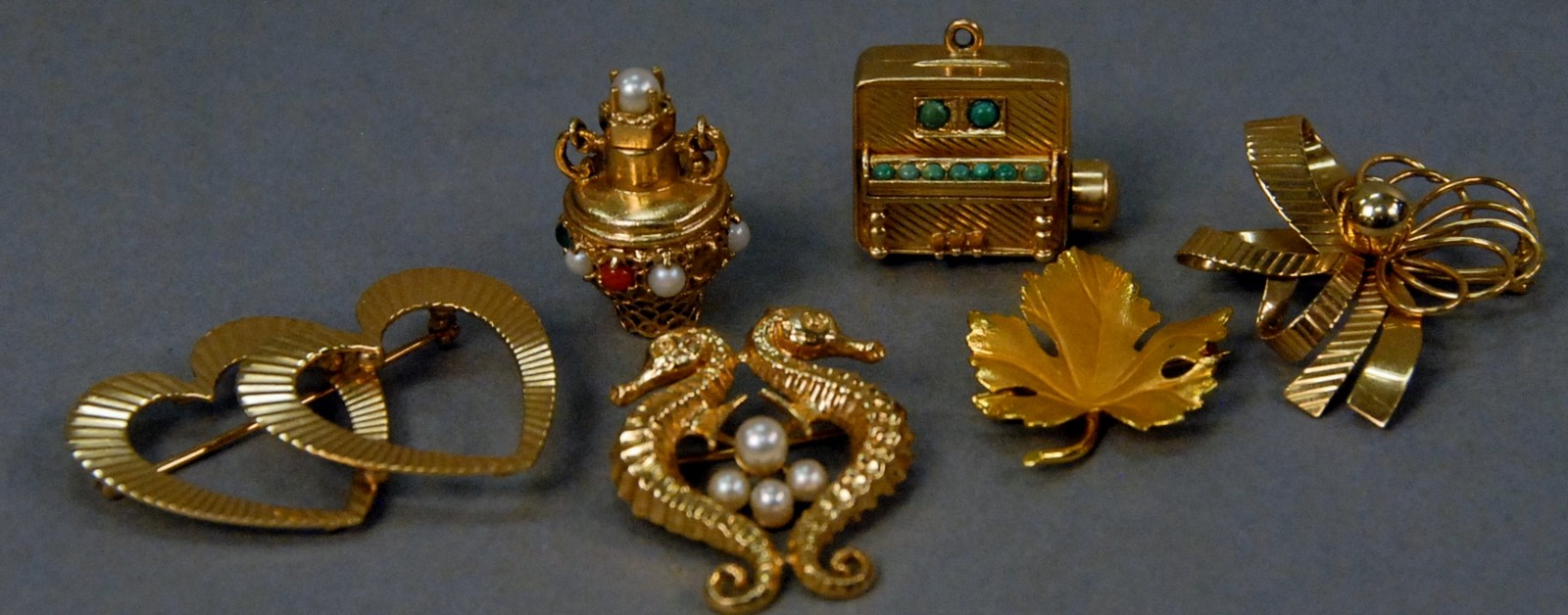 Six piece lot to include four 14K gold pins, two charms. One charm is piano music box 26.4 grams, 38.8 grams plus piano. Provenance: Property from a Private Collection Sold for the Benefit of the Virginia Historical Society.