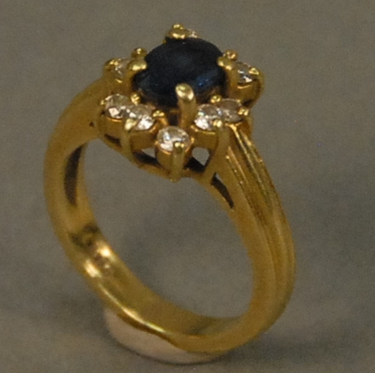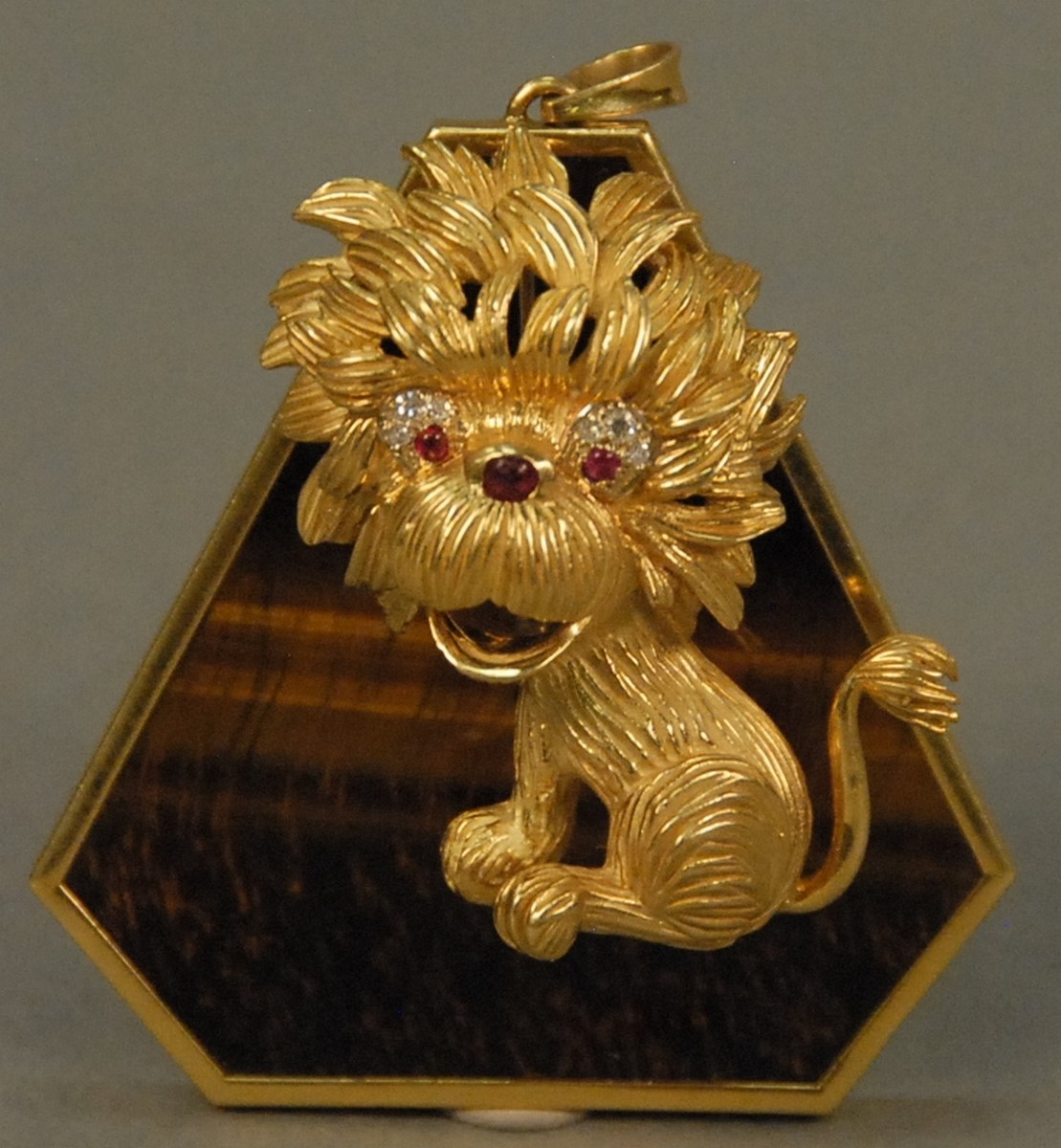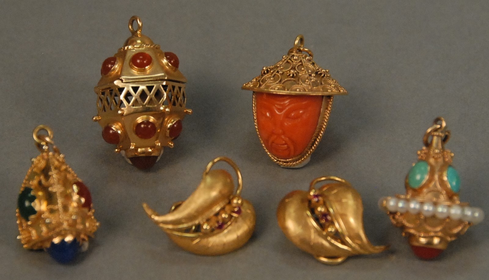 Six piece lot to include four 18K gold large charms, three with mounted stones, one with coral faces plus pair of clip on earrings. 53 grams total weight. Provenance: Property from a Private Collection Sold for the Benefit of the Virginia Historical Society.