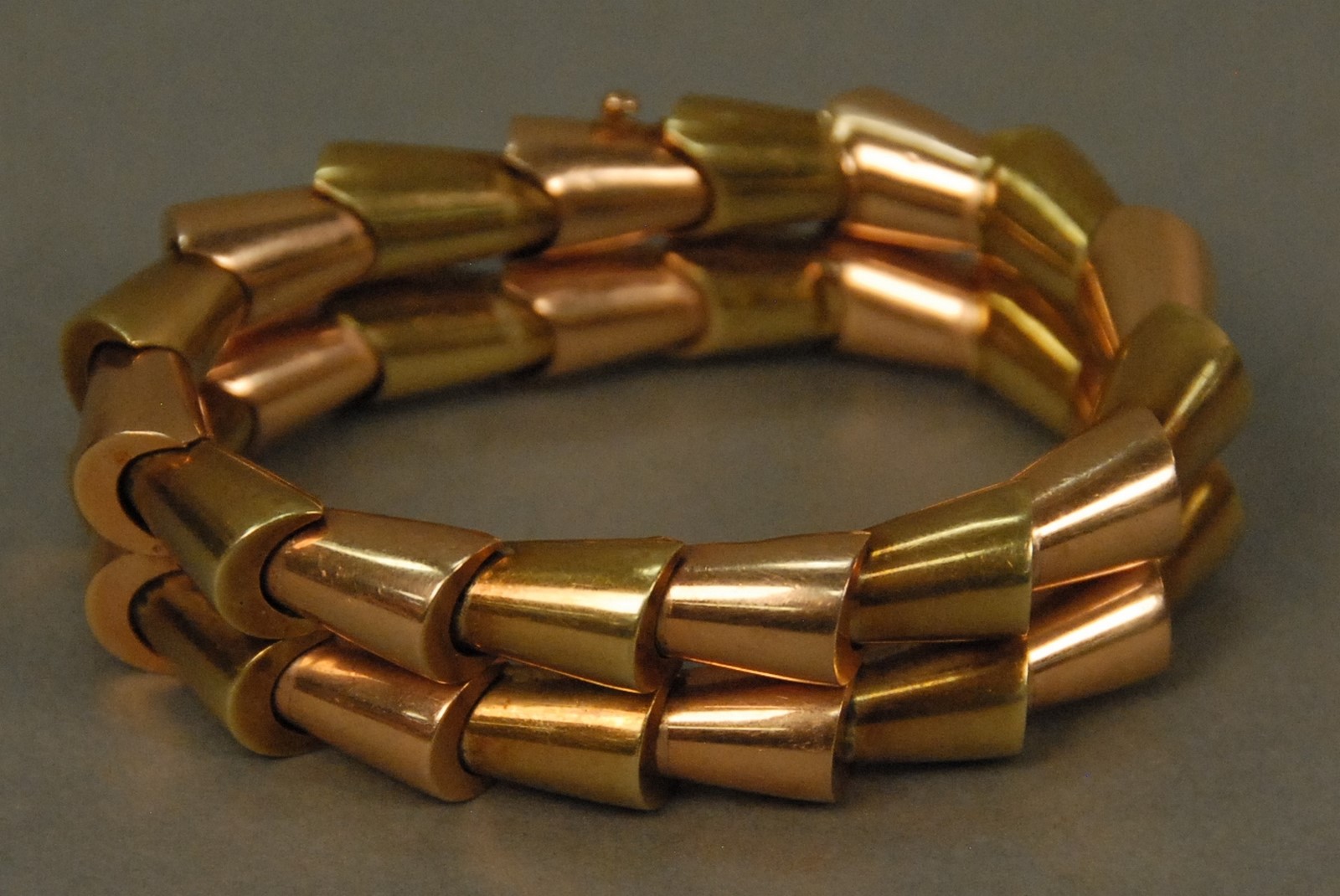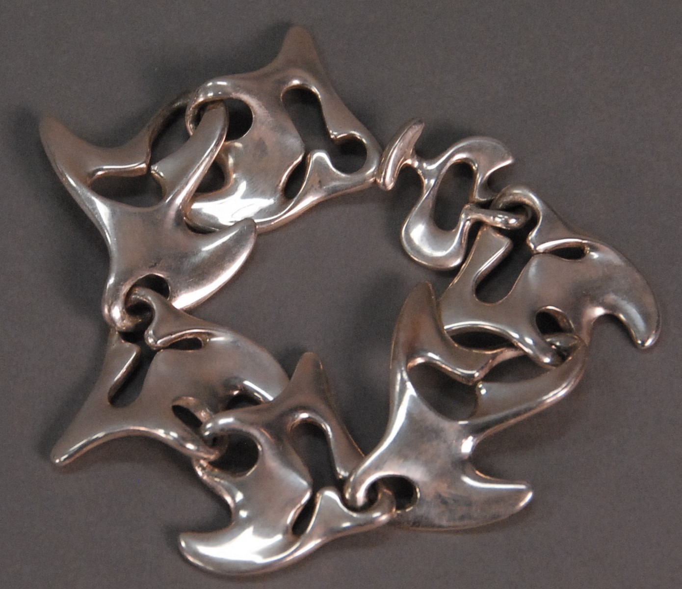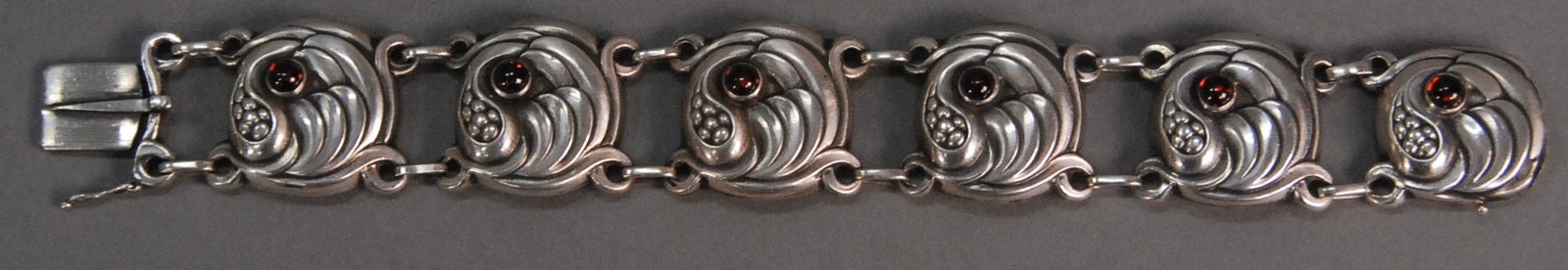 Two Georg Jensen bracelets sterling silver including one with green stones and one with black stones, length 7 1/2in, both are signed Georg Jensen Denmark 56A.