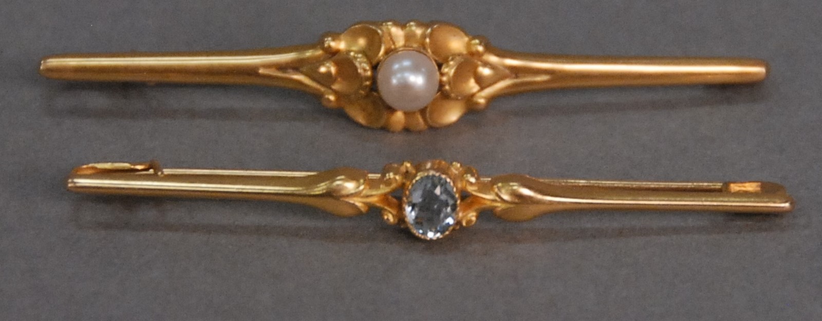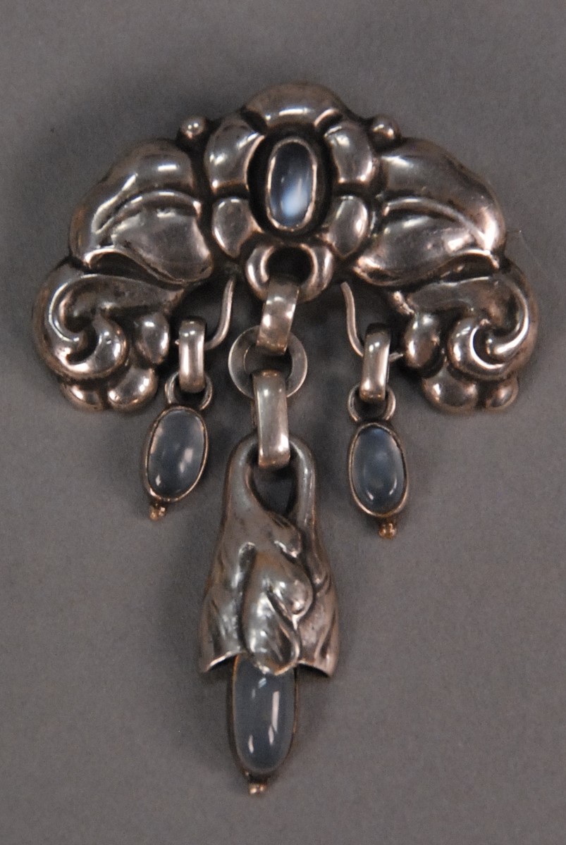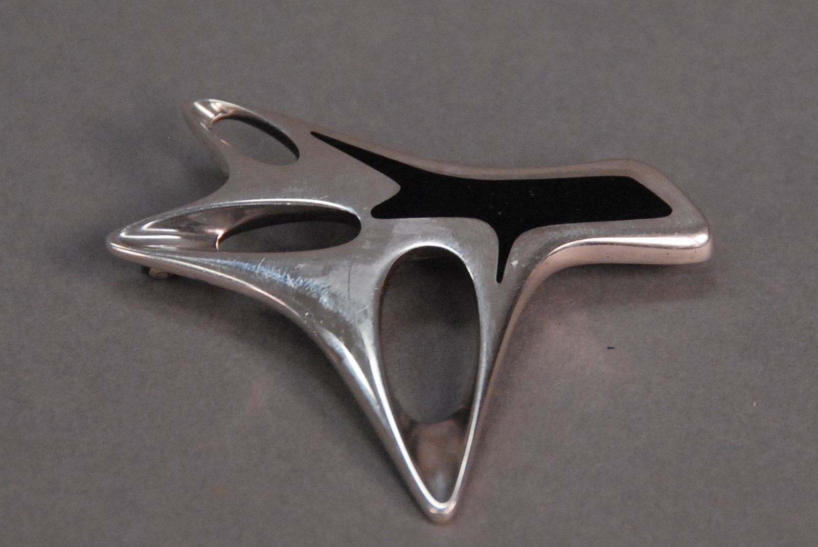 Three Georg Jensen pins including, bar pin with red stone marked Georg Jensen Denmark 925 Model 224 B, pin with foliate design with green stone signed George Jensen 925 model 13, and pin with leaf design and red stone marked Georg Jensen Denmark 925 model 107.