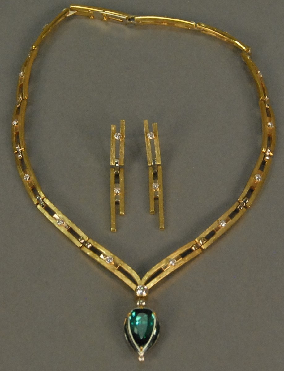 Alberto Becker 18K gold convertible collier and matching earrings, collier with one diamond .46 cts plus fourteen small diamonds having removable 7.38 ct tourmaline earrings having two diamonds each with all original paperwork and key to remove tourmaline pendant. 95.1 total grams