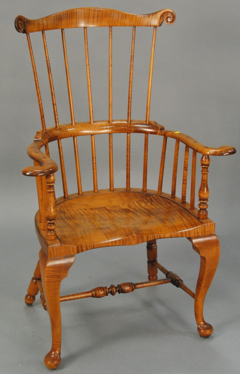 Two D.R. Dimes Windsor style armchairs, one of figured maple with fan back and cabriole legs, the other with fan back on bold turned legs, each signed D.R. Dimes. seat ht. 18 in. and seat ht. 17 3/4 in.