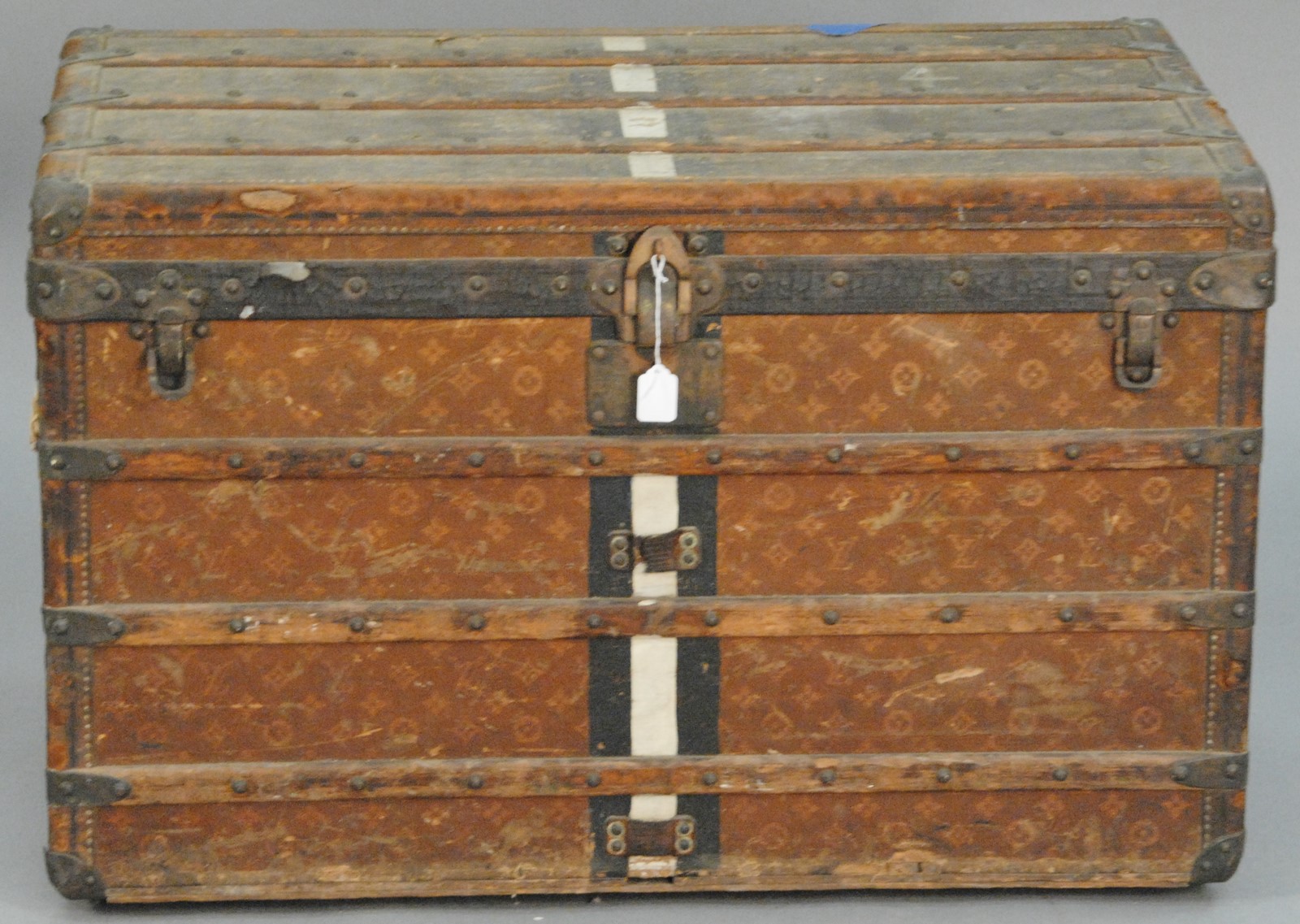 Louis Vuitton trunk with wood straps, interior with two trays one with two covers, original labels Sole Depository in the U.S. John Wanamaker Philadelphia N.Y. and Louis Vuitton Paris, London #300005 top front and rear painted black and white line. ht. 22 1/2 in. wd. 36 1/2 in. dp. 21 in.