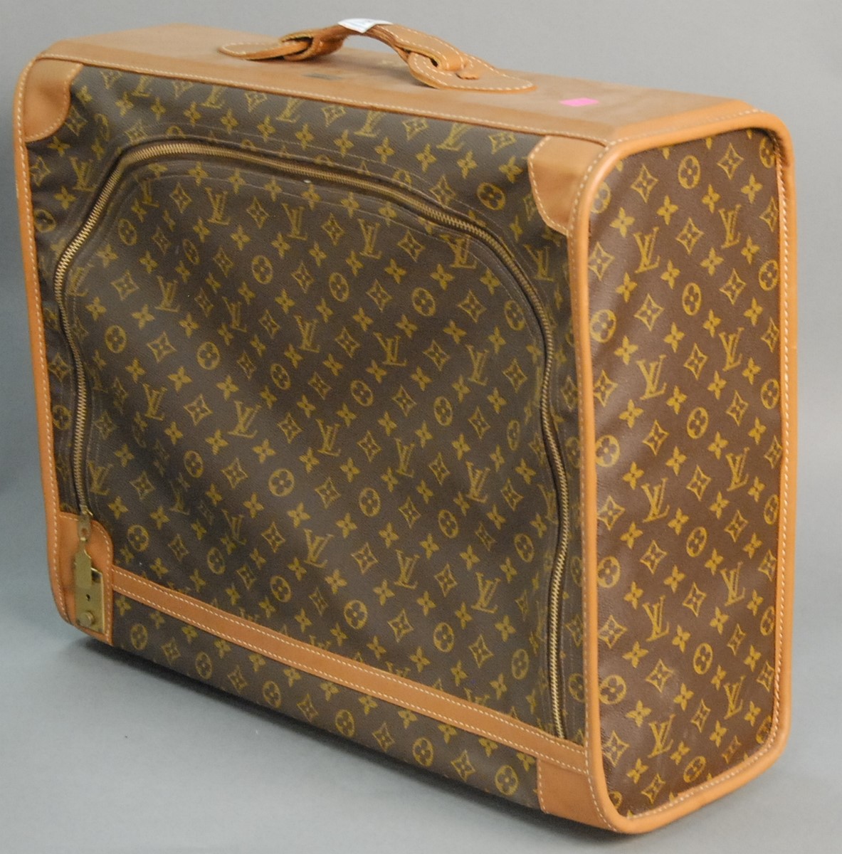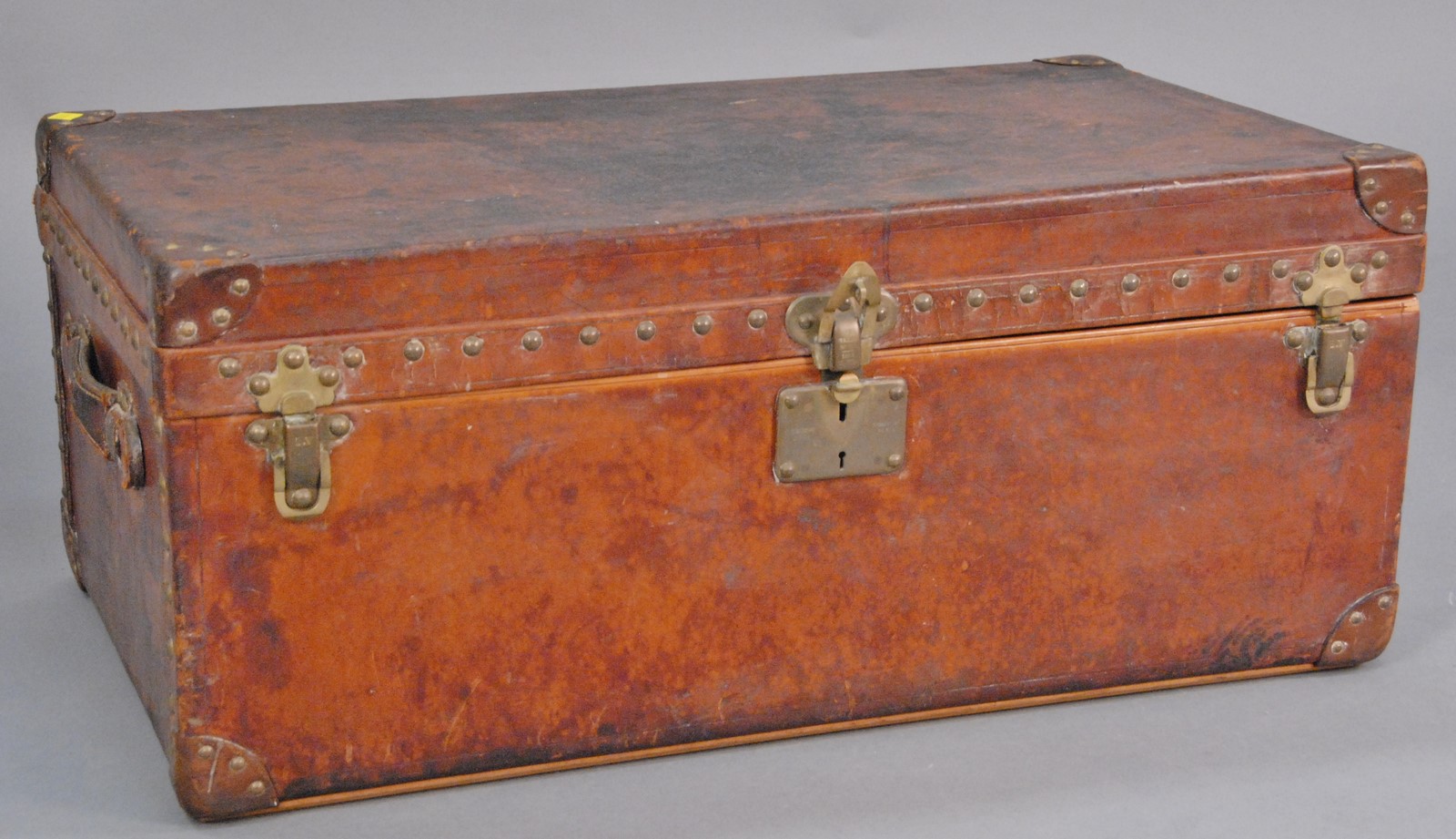 Louis Vuitton leather trunk with original interior label Louis Vuitton, Paris, Nice, Lille, London 728590 some staining on top. ht. 13 1/2 in. wd. 31 3/4 in. dp. 18 1/2 in.