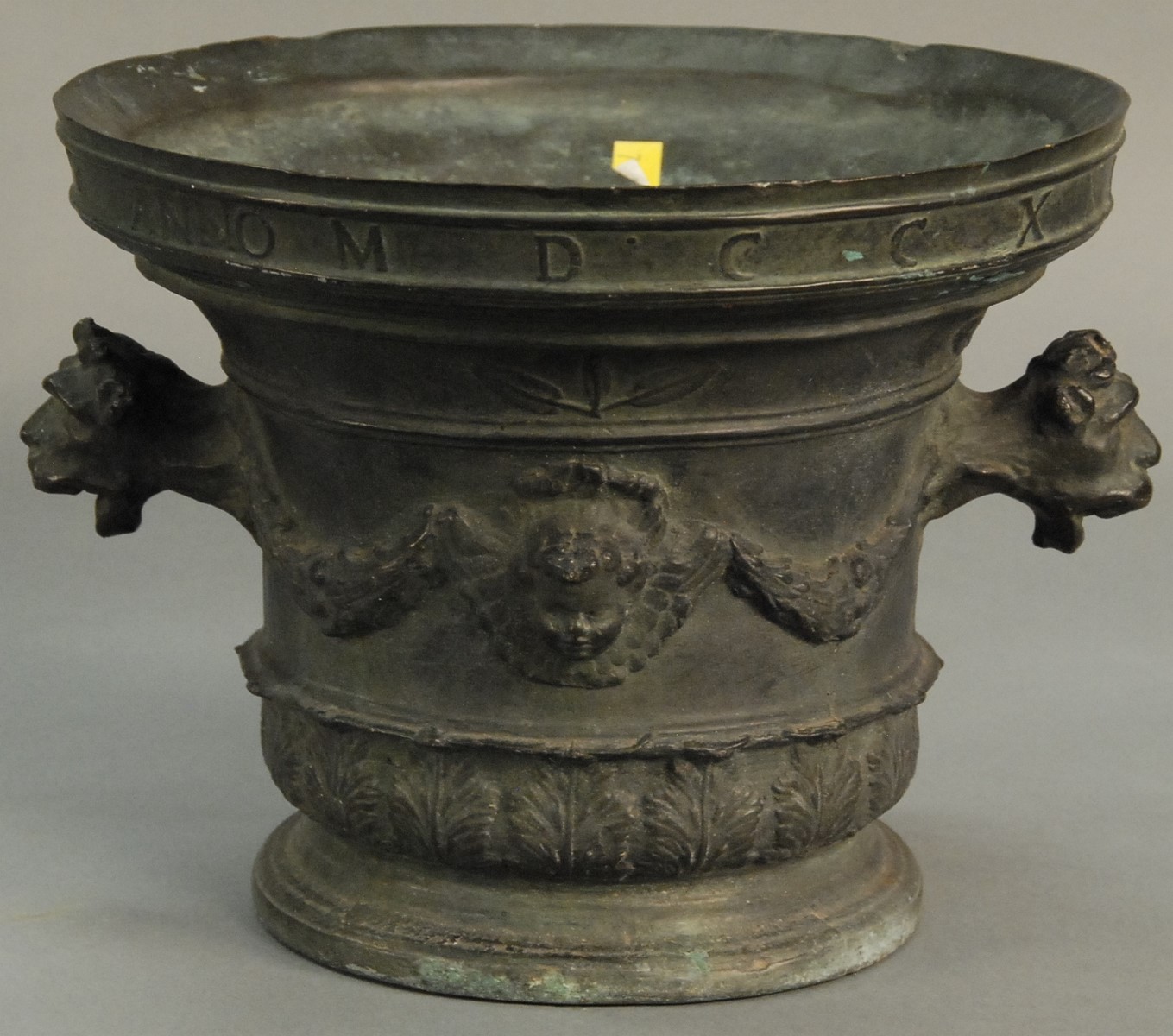 Large early bronze Renaissance/Baroque mortar having figural handles and cherub head mask, marked Georgius Mazzochus Fecit Anno MDCCXXI 1721. ht. 10 1/2 in. dia. 13 1/2 in.