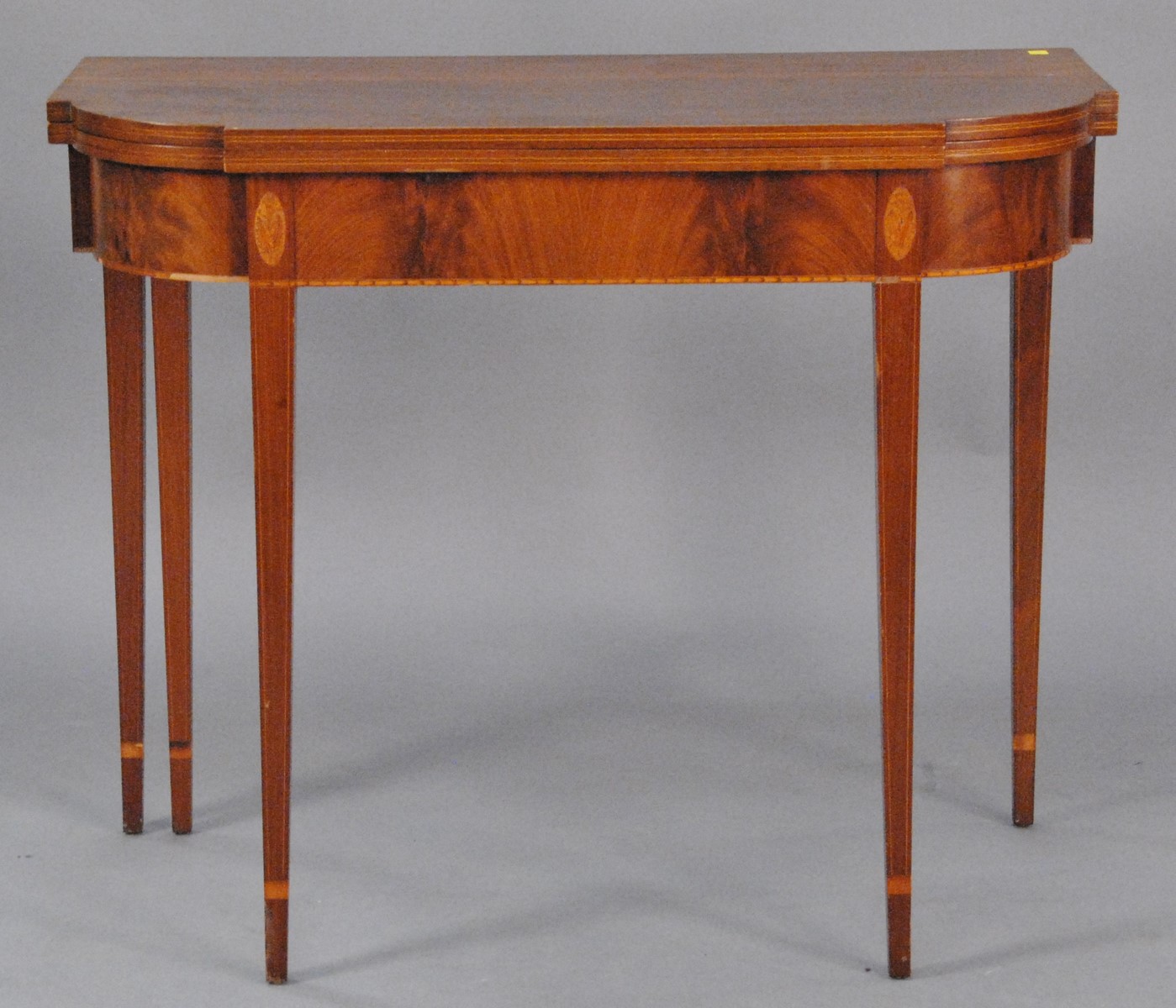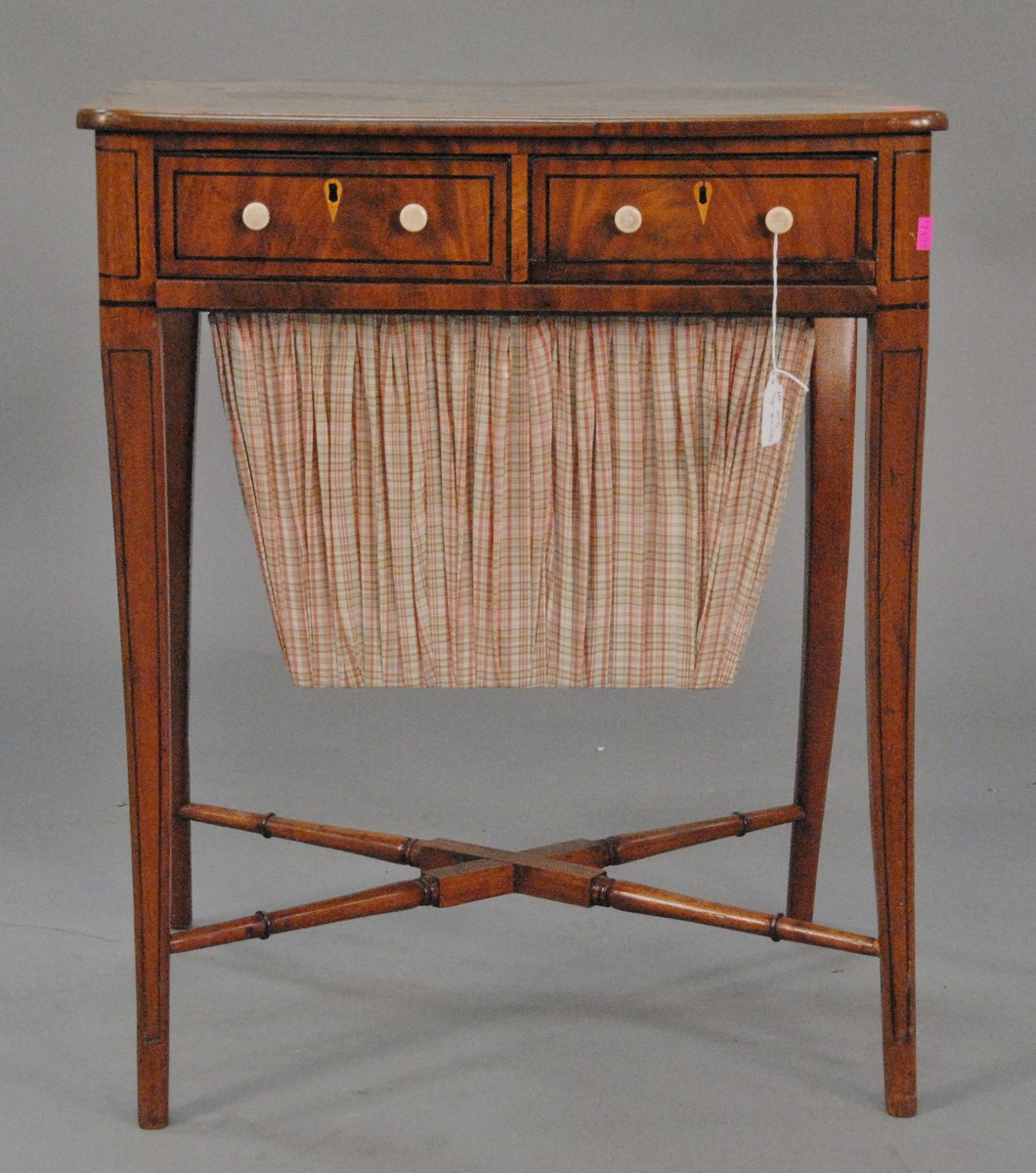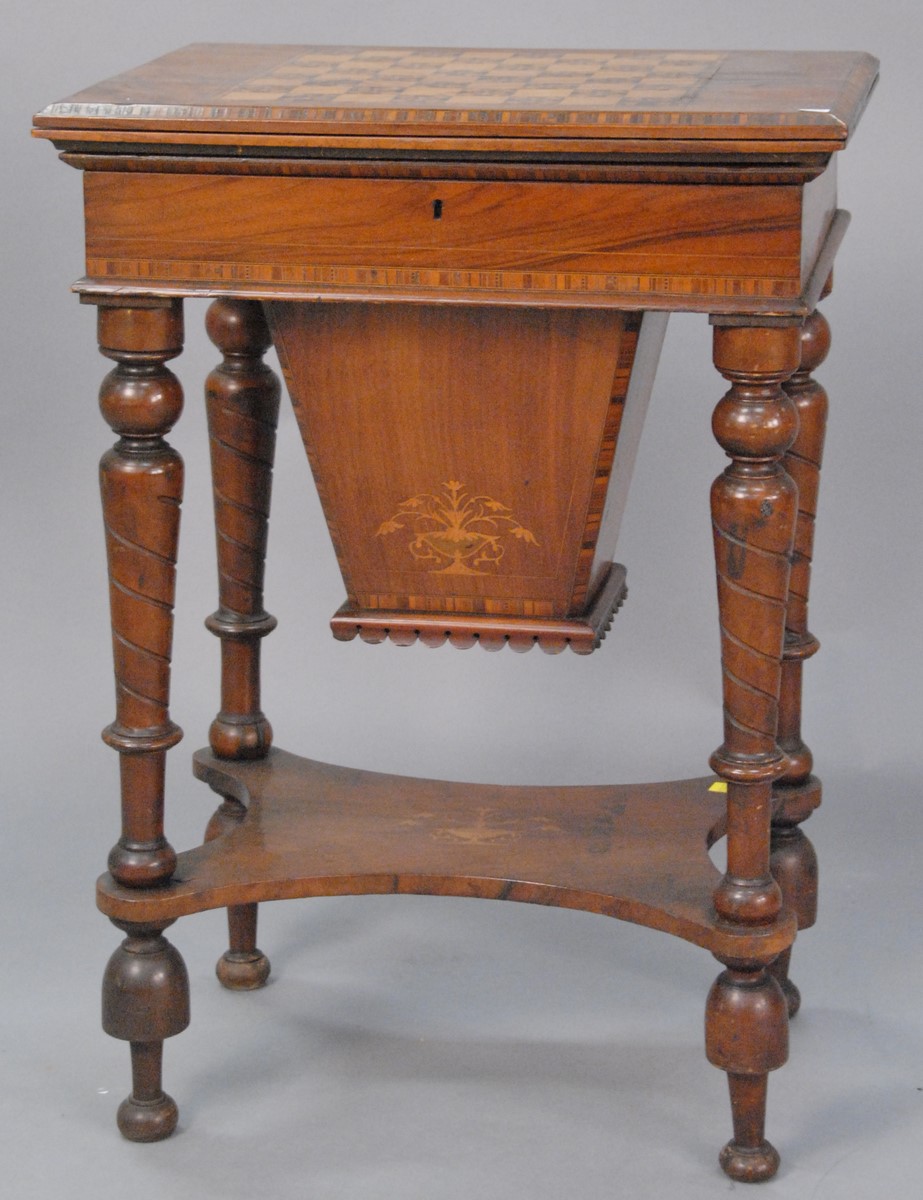 English walnut games table having inlaid chess board top opening to reveal felt playing surface surrounded by tooled leather which opens to sewing/work table with fitted compartments. ht. 30 in. open: 21 1/4 x 31 1/4