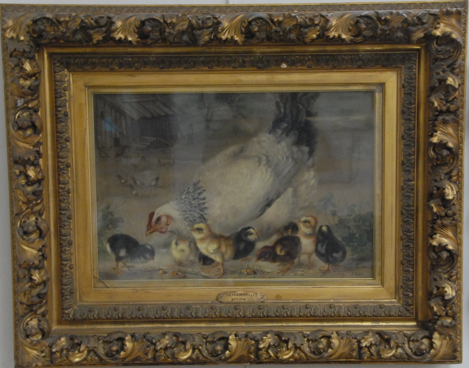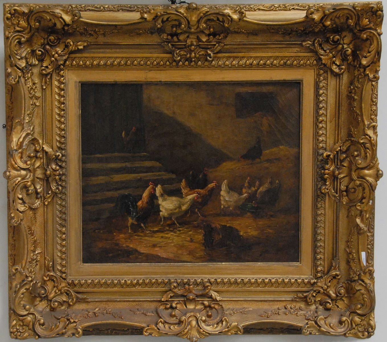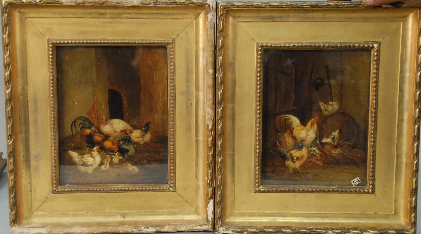 Pair Claude Guilleminet 1821-1860 CHICKENS AND TURKEY IN BARN CHICKENS AND PHEASANT IN BARN pair of oil on board paintings signed lower left Guilleminet 10 x 8