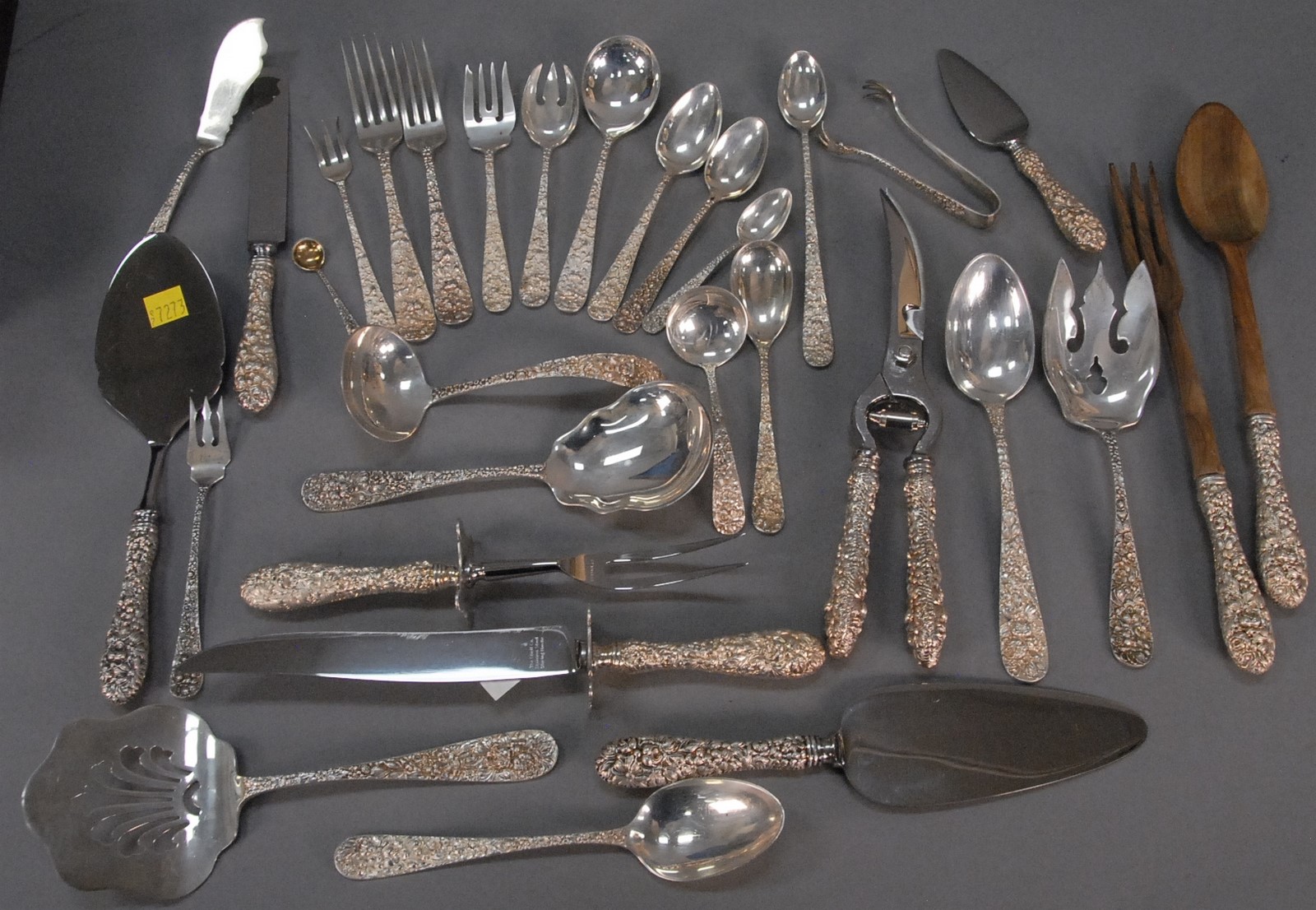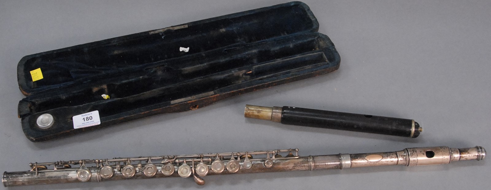 Meinell flute, silver and ebony with unmarked gold plaque marked W. R. Meinell New York, in original leather felt lined carrying case, near match to flute made for and used by Blind Tom, African American Musical Prodigy one small piece of ebony missing. lg. 26 3/8 in.