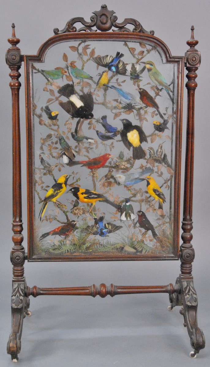 Victorian firescreen with two sided glass cabinet having fluted supports on carved base, interior with thirty-four birds on realistic branches, Preserved by H. Burton, New Oxford St. London, circa 1870. ht. 48 in. wd. 22 in. dp. 4 in. Provenance: Property from The Estate of Margaret Oliphant of Old Lyme, Connecticut