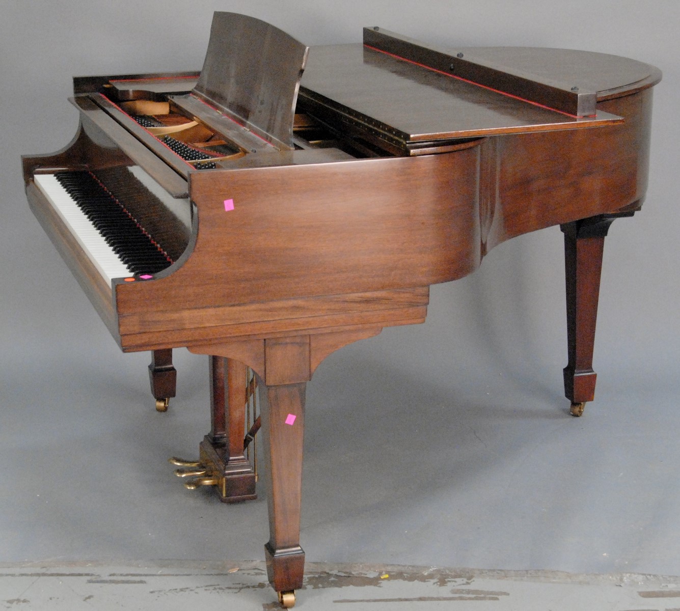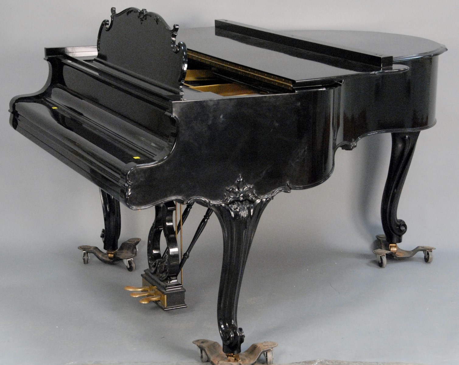 Louis XV style Steinway Baby Grand piano and bench, ebonized, having cabriole legs ending in scrolled feet, M Model 303465 S3175, in excellent condition.
