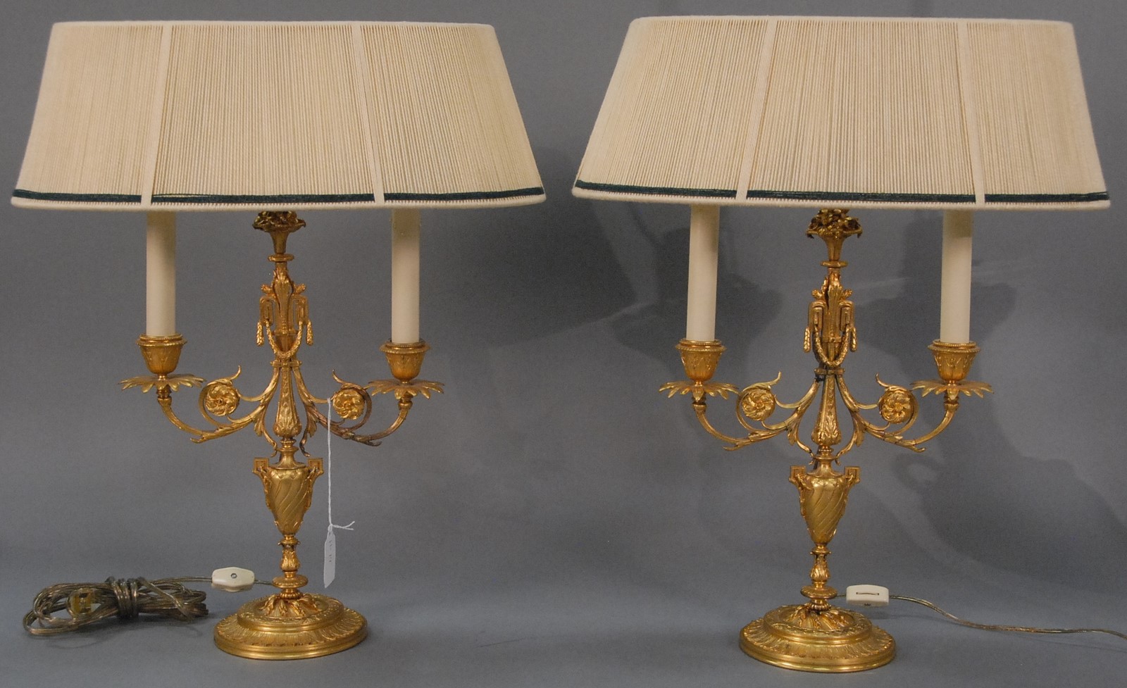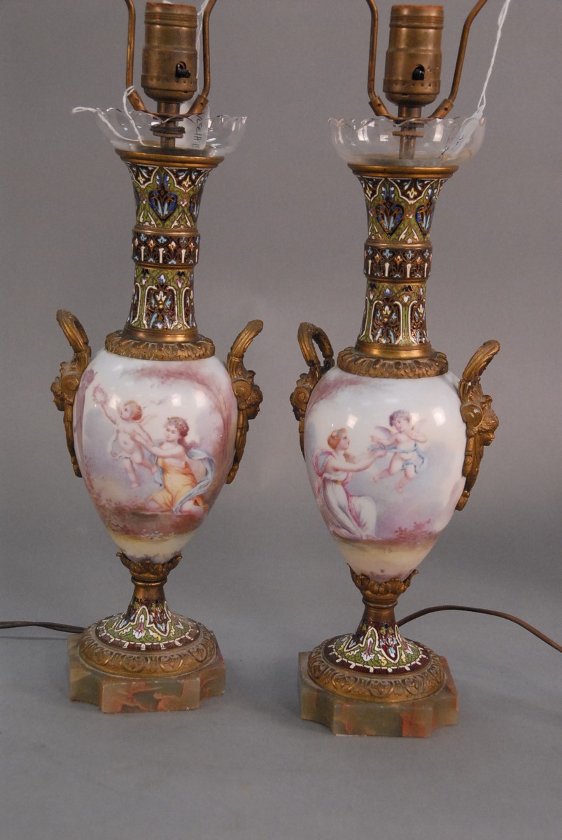 Pair of Sevres style porcelain vases made into table lamps having enamel decorated tops and bases on bronze footed base, body with hand painted putti, artist signed. vase ht. 13 in. Provenance: Property from The Estate of Margaret Oliphant of Old Lyme, Connecticut