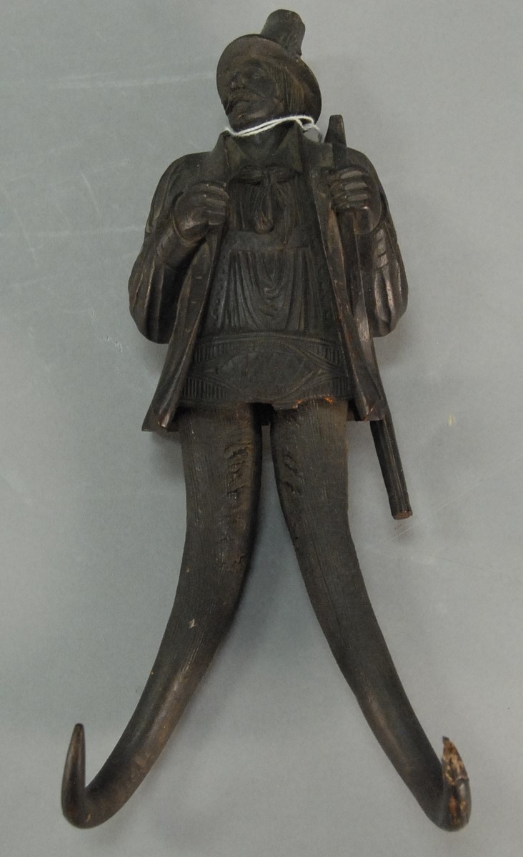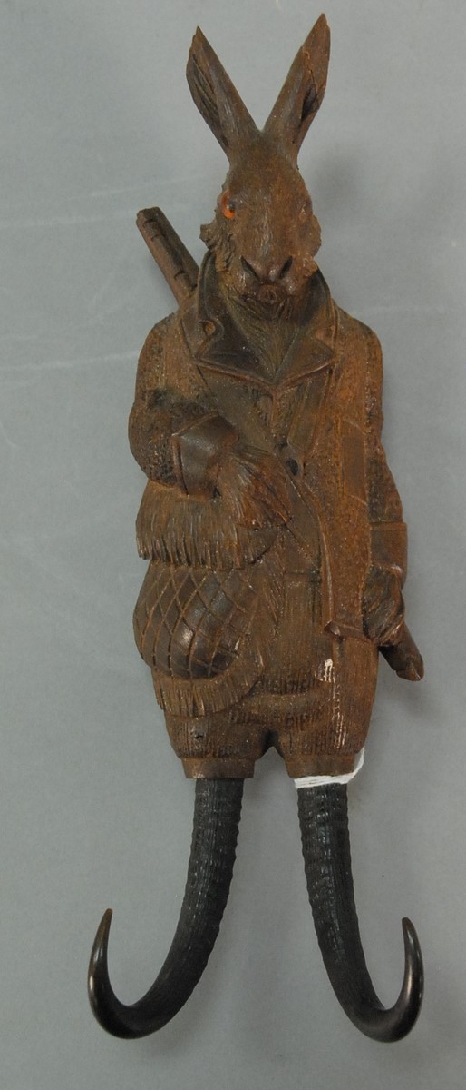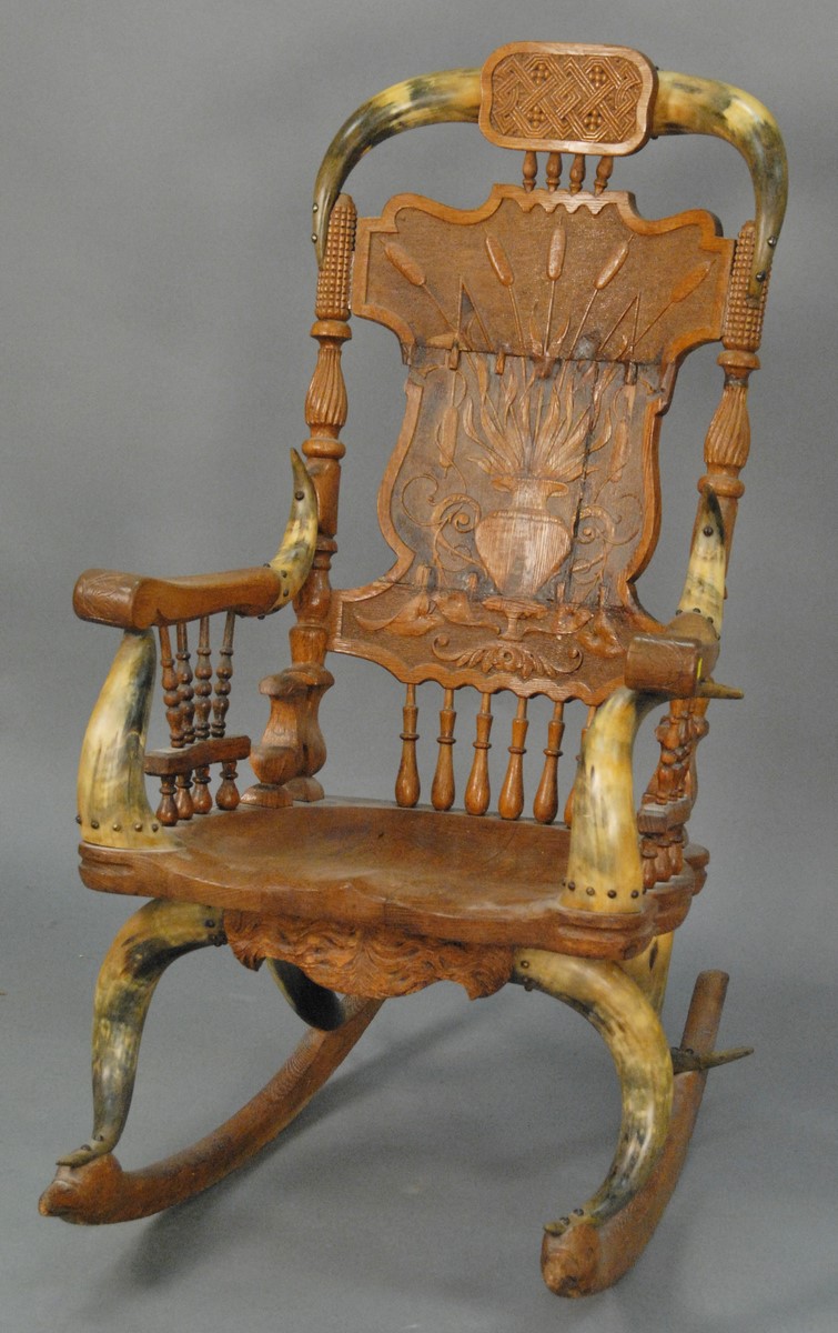 Victorian oak and horn rocker having horn back, arm supports, and supports to oak rockers in form of eagle head ends, back with carved cattails back in need of repair. ht. 46 in.