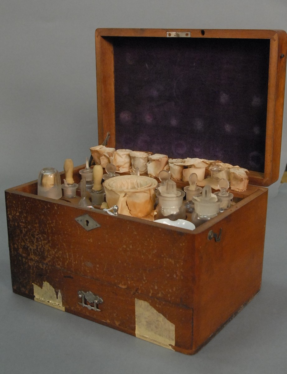 Whitall Tatum apothecary box with test tubes, bottles, nest of jars, and funnels, all in original fitted wood box. ht. 6 3/4 in. wd. 10 3/4 in. dp. 7 1/2 in. Provenance: Property from a Private Collection Sold for the Benefit of the Virginia Historical Society.