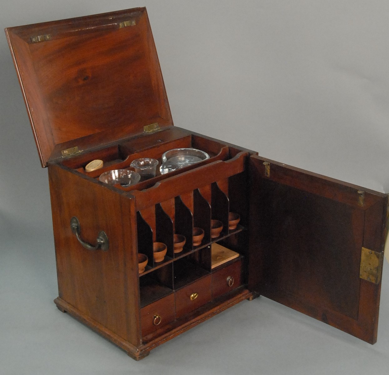 Mahogany pharmacist cabinet, top opens to reveal fitted interior with several glass pieces, front door opens to compartments, 19th century. ht. 13 1/4 in. wd. 13 1/4 in. dp. 12 1/2 in.