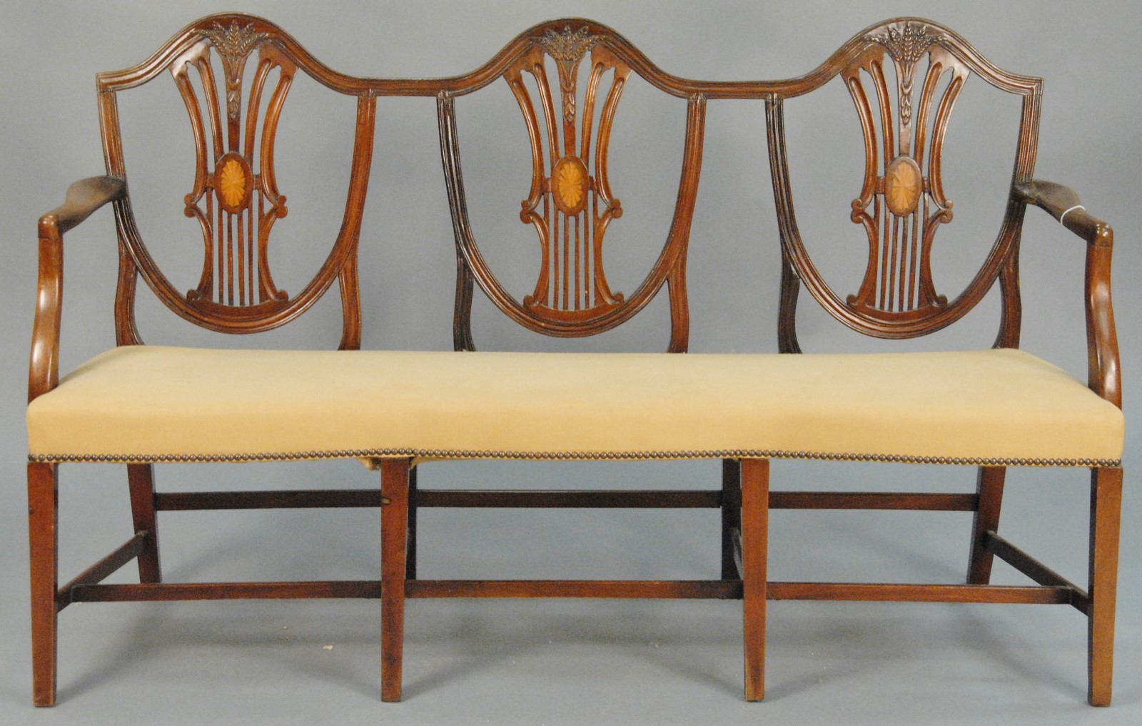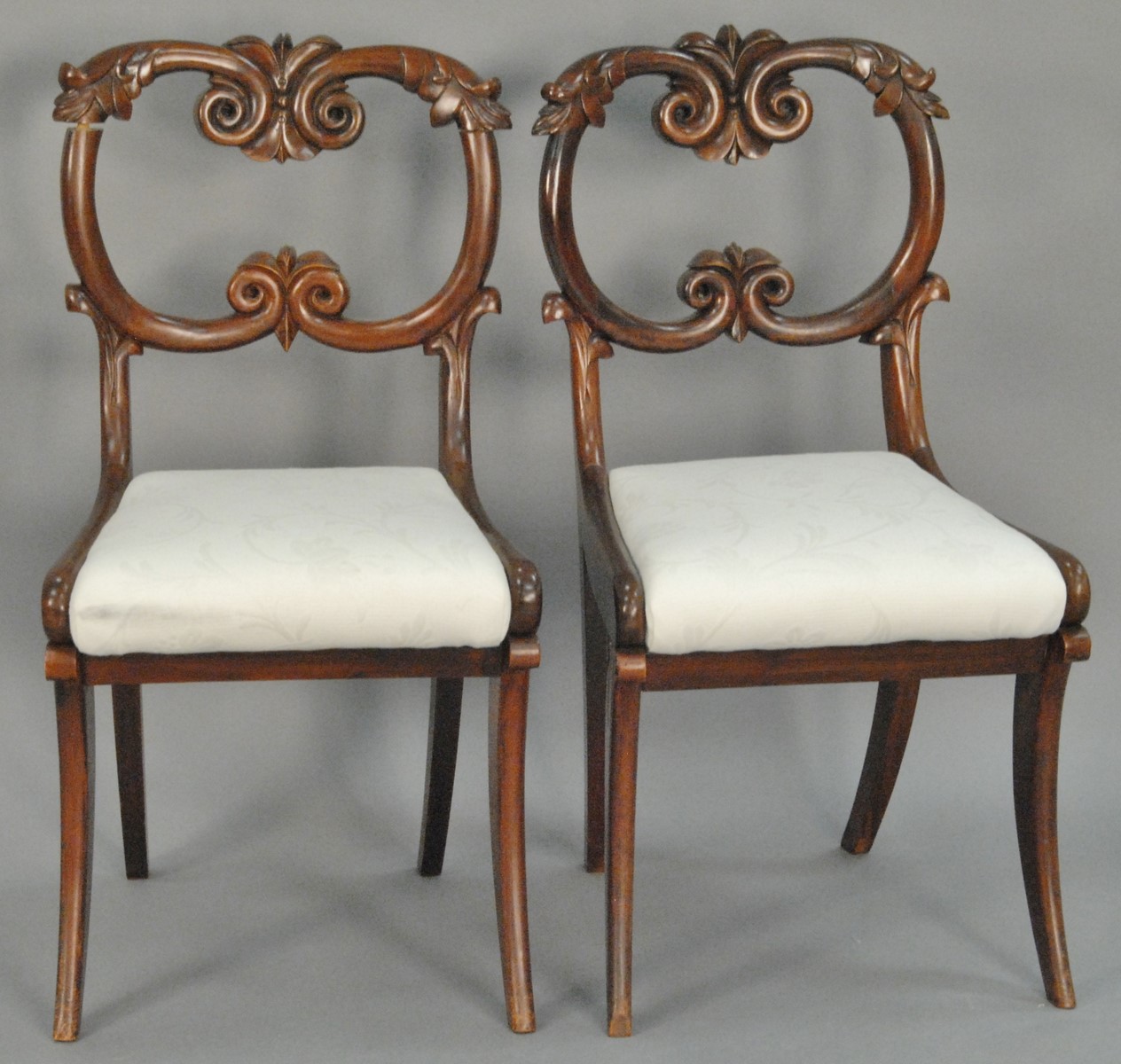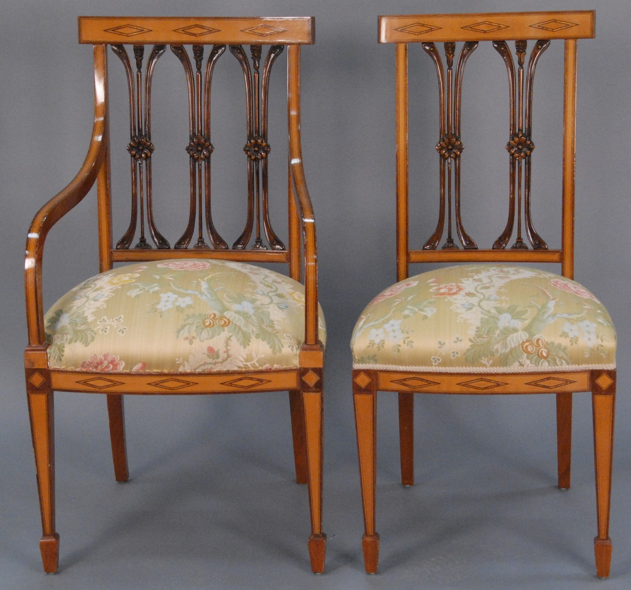 Set of ten satinwood and mahogany dining chairs, each with carved backs and silk upholstered seats on inlaid frames with square tapered legs ending in spade feet, two armchairs and eight side chairs, six chair backs having darker stain.