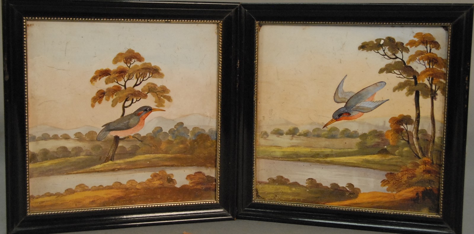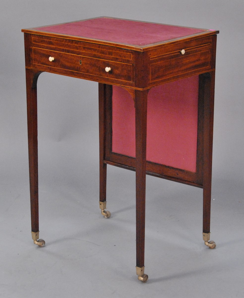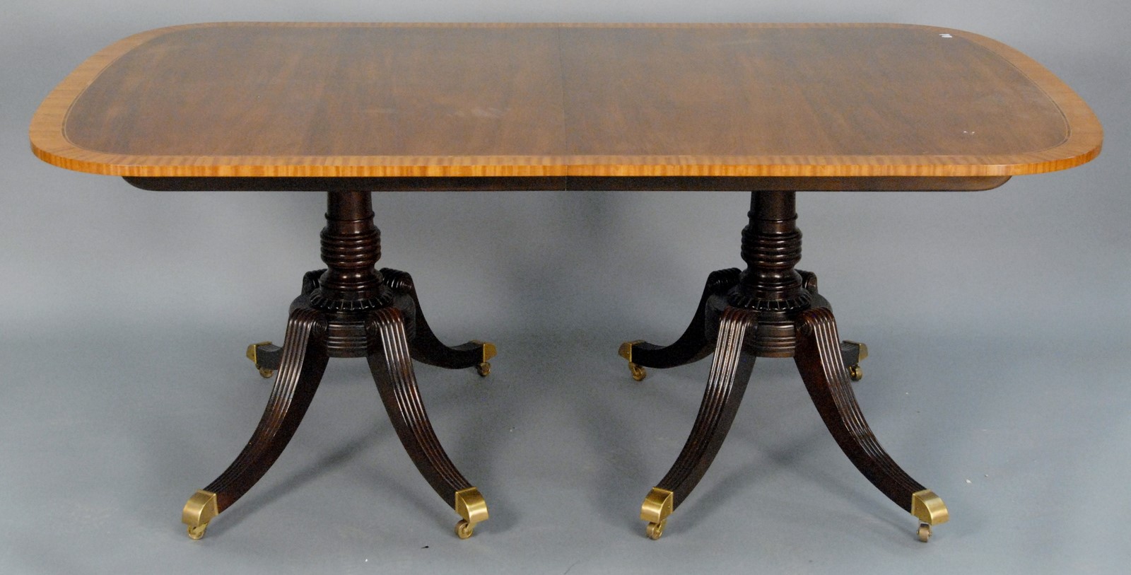 Set of ten satinwood and mahogany dining chairs, each with carved backs and silk upholstered seats on inlaid frames with square tapered legs ending in spade feet, two armchairs and eight side chairs, six chair backs having darker stain.