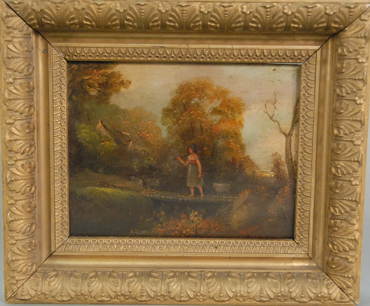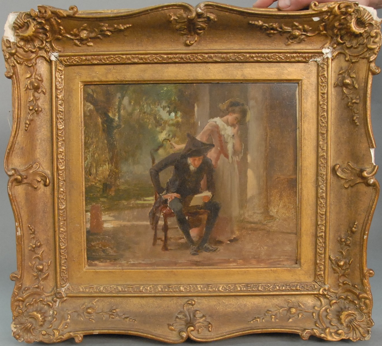 Attributed to Marcus Clayton Stone 1840-1921 THE LADS LETTER oil on panel unsigned part of old paper label stating Sketch Marcus Stone, old faint writing on verso 10 1/2 x 12 1/2