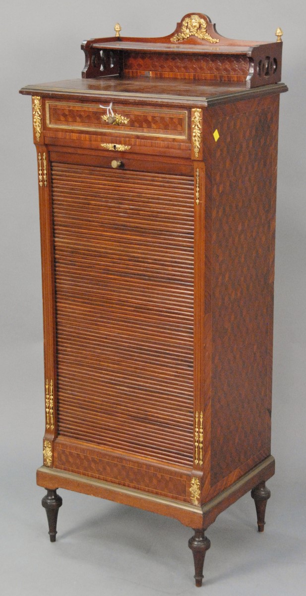 Louis XVI style inlaid lingerie cabinet, top having small shelf over drawer with five drawers behind tambour door, all set on turned legs, with gilt bronze mounts. ht. 49 1/2 in. wd. 17 1/4 in. dp. 13 3/4 in.