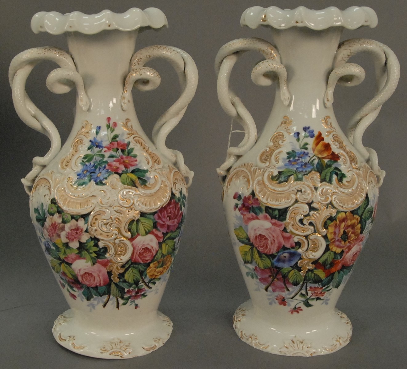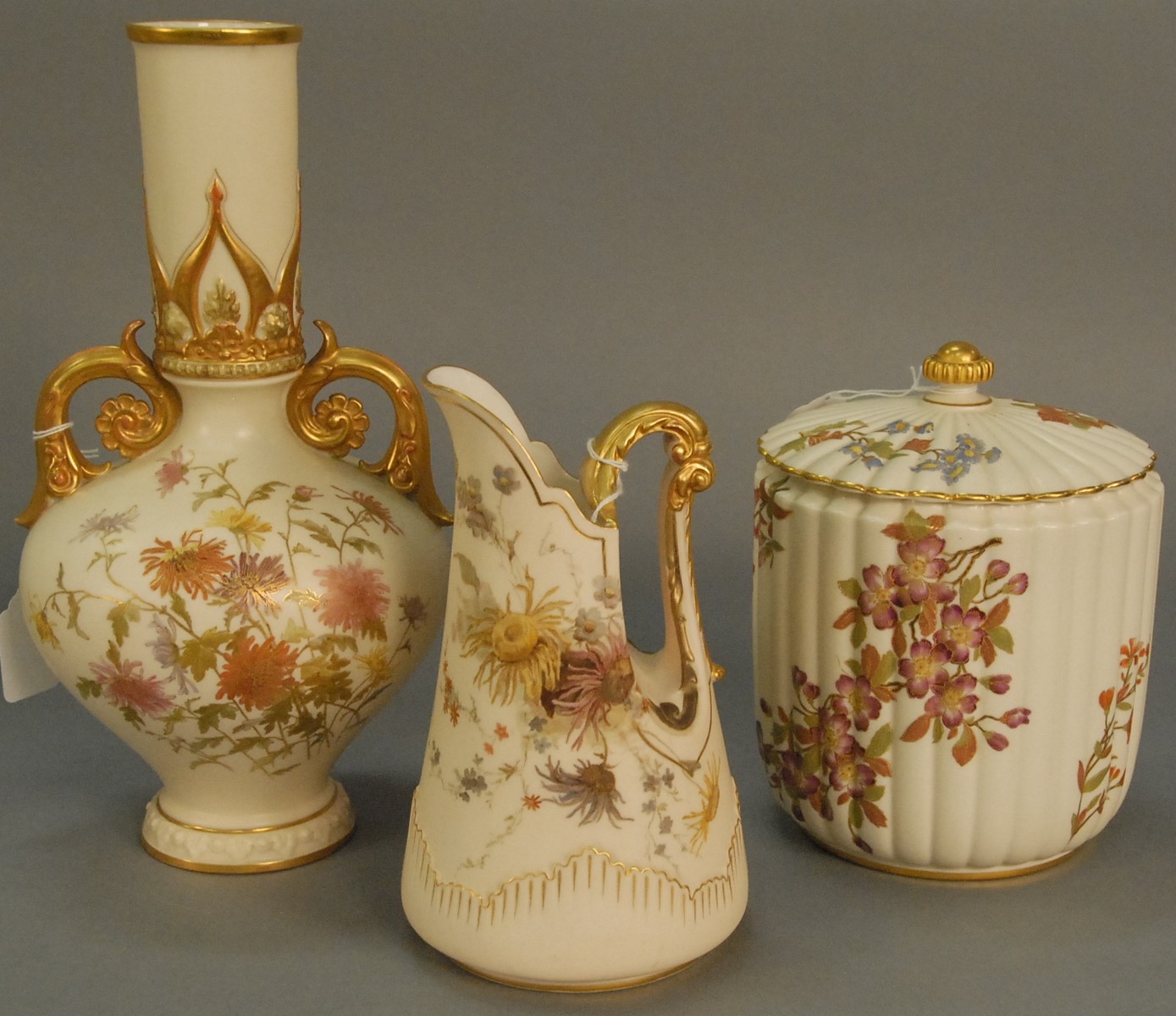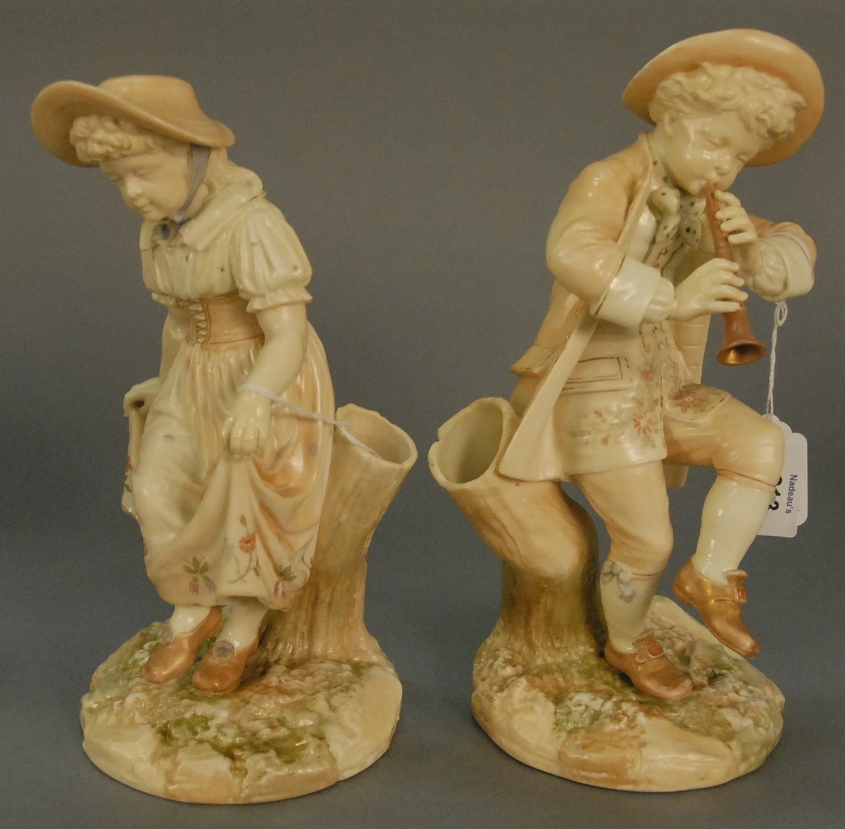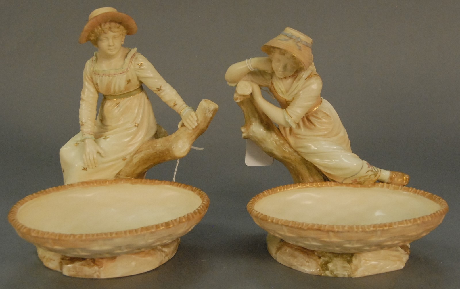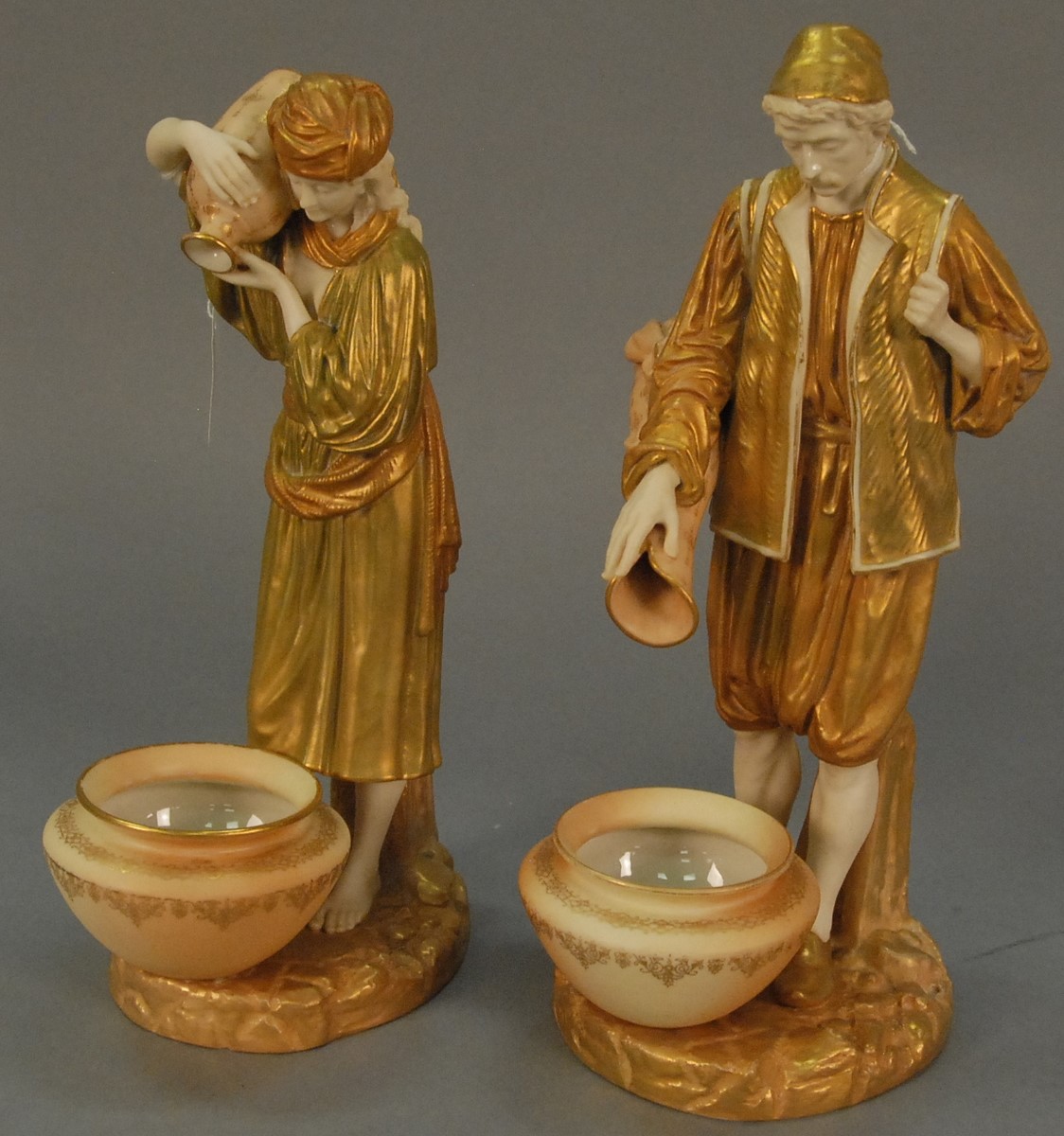 Pair of Royal Worcester figures, each with gilt decoration and carrying vessels emptying into basins, marked with purple marks, ht. 11 1/2 in. & ht. 12 1/2 in.