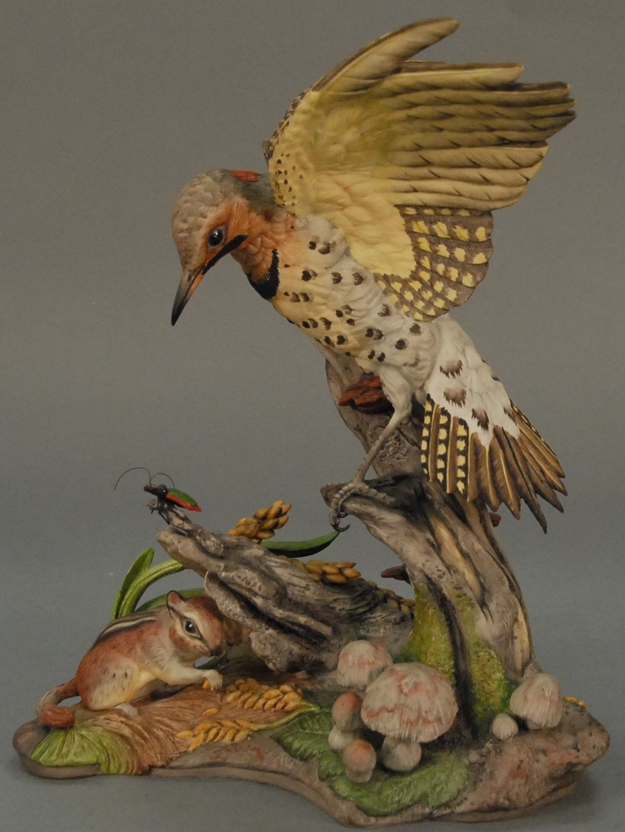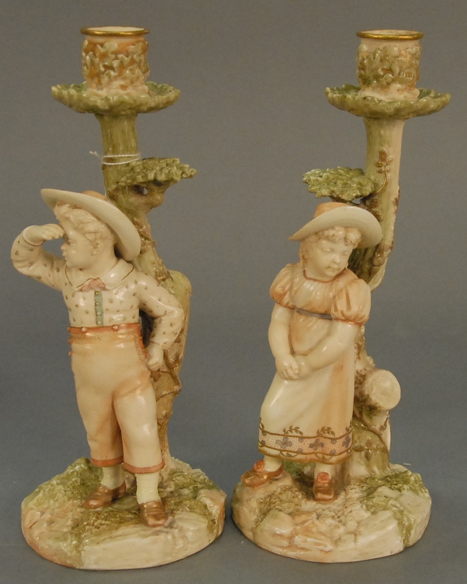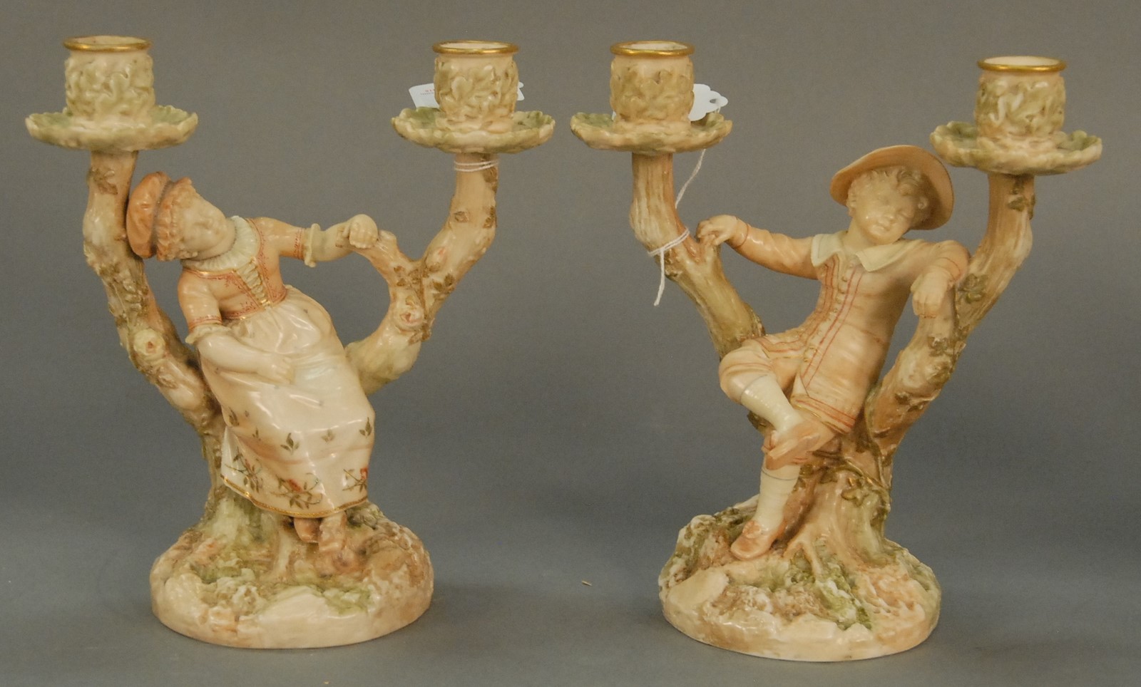 Pair of Royal Worcester figural double candlesticks by Hadley, boy and girl in a tree, two light, signed on bottom side, Hadley with green mark. ht. 8 3/4 in.