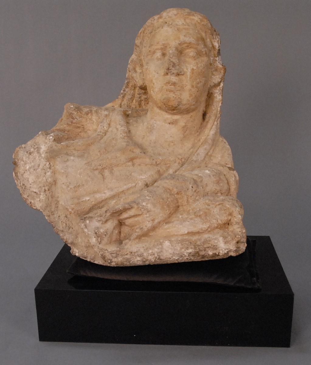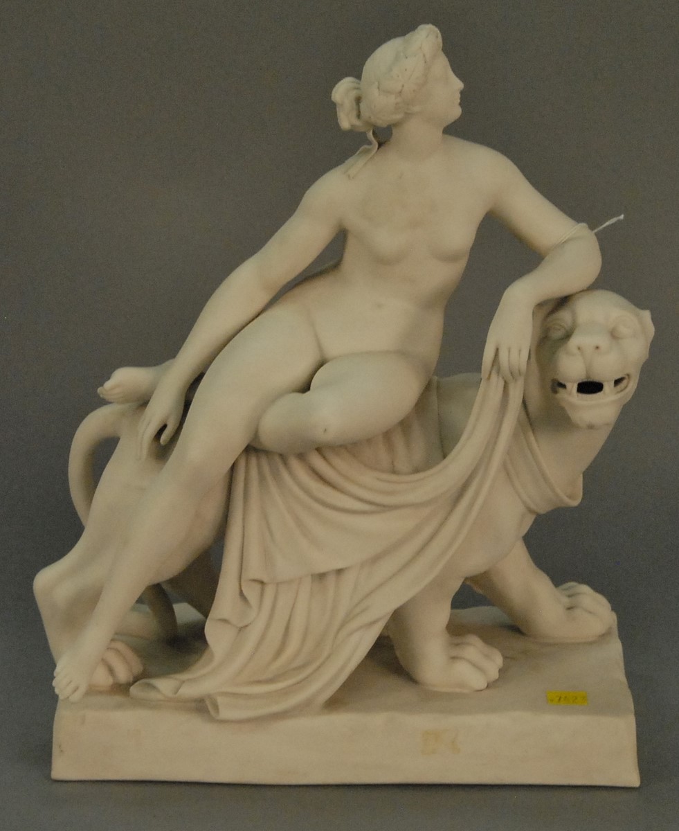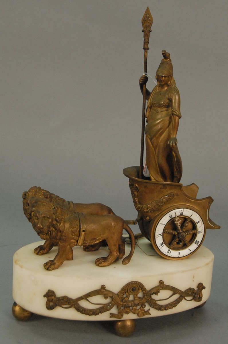 Bronze figural clock, Roman figure in chariot pulled by pair of lions set on white marble base with ball feet, back of clock marked Black Starr & Frost. ht. 14 1/2 in.