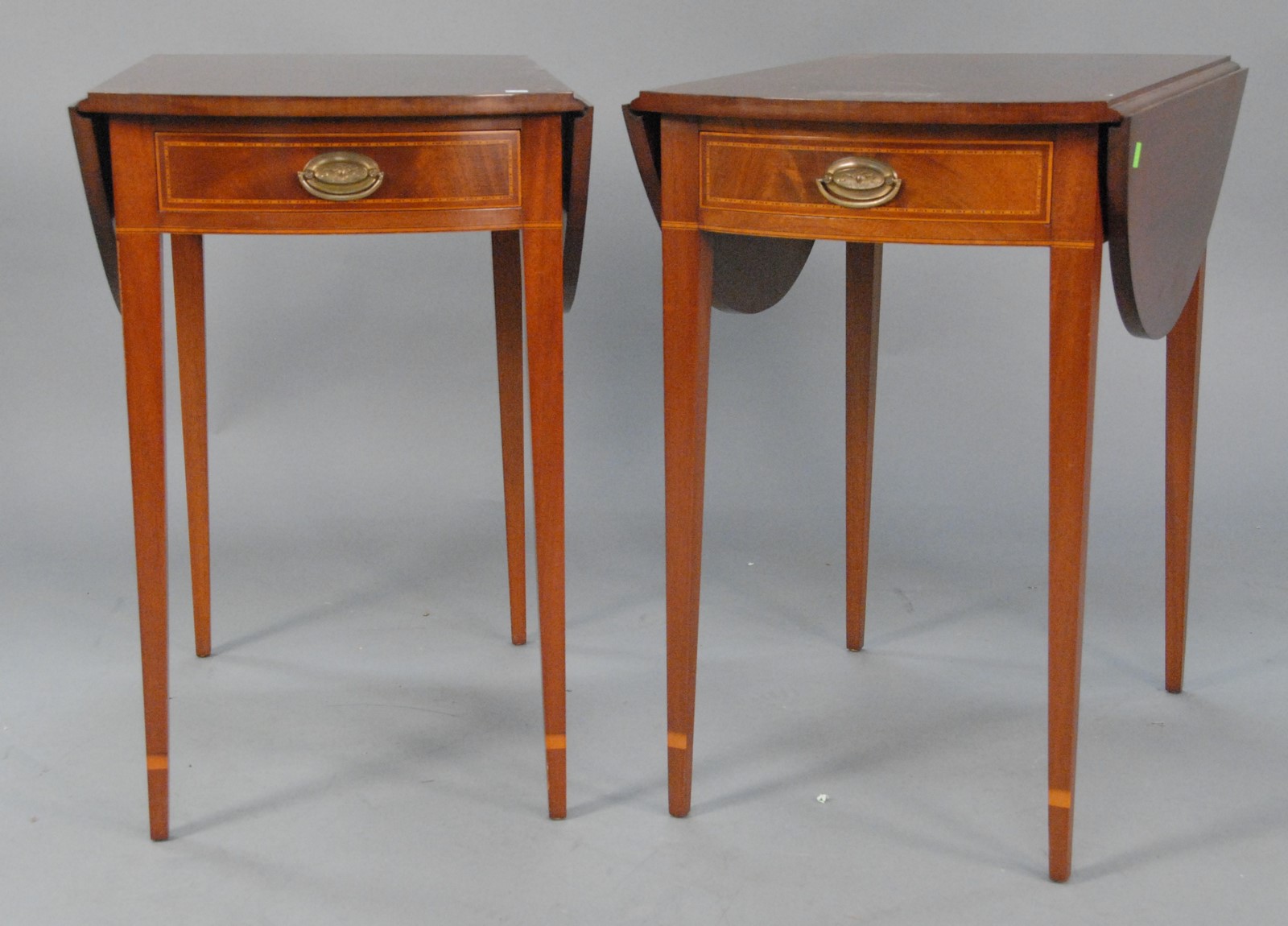 Pair of Margolis mahogany Pembroke tables having oval drop leaves and bowed ends with drawer all set on square tapered legs, signed Margolis. ht. 27 in. 26 1/4 x 34 1/4