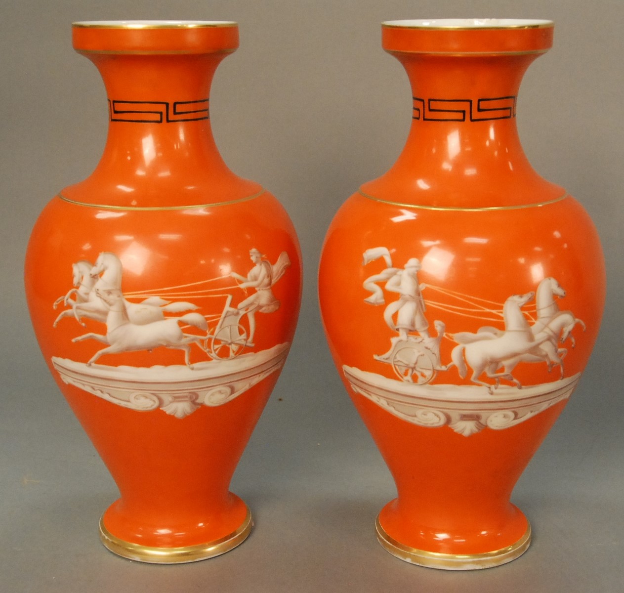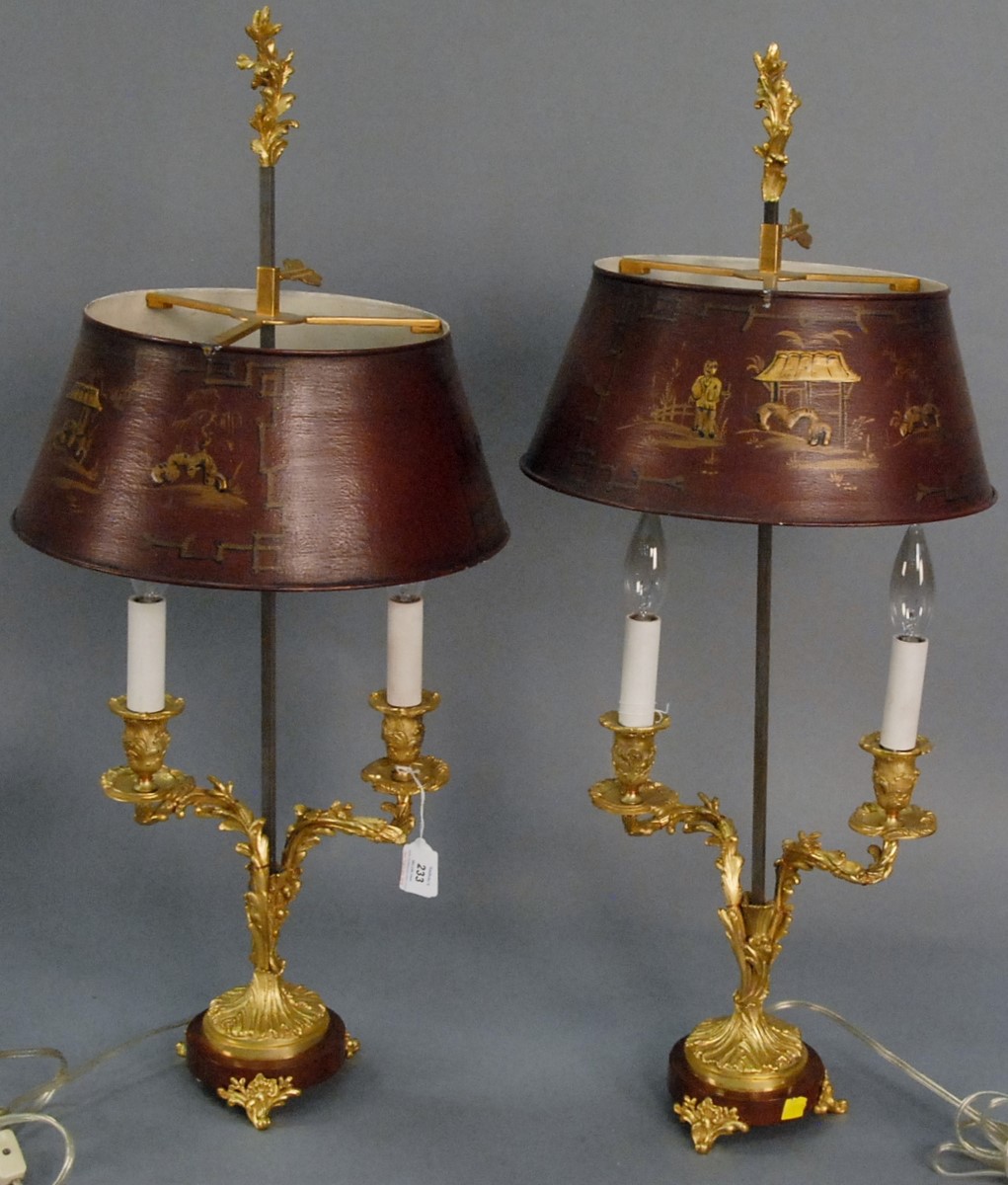 Pair of gilt bronze candelabras made into table lamps with paint decorated metal shades and gilt bronze finial, all set on rouge marble bases and gilt bronze feet. total ht. 30 1/2 in.
