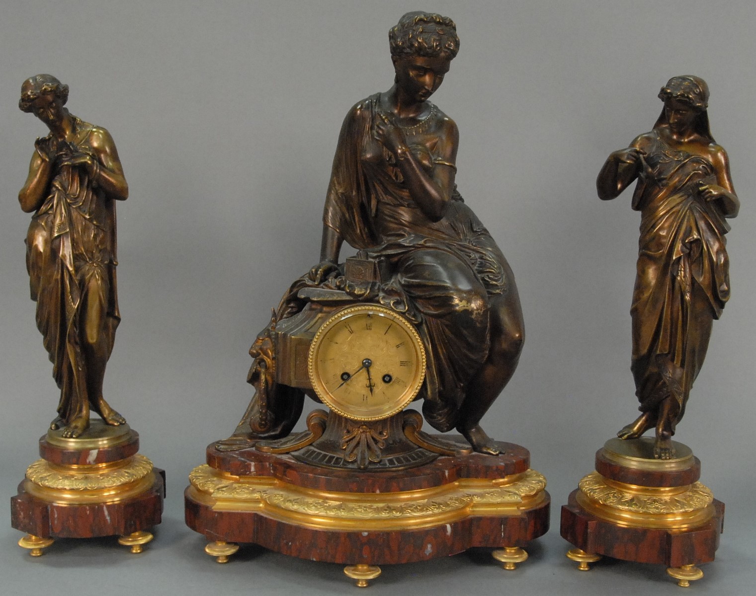 Bronze three piece clock set, clock with figural top along with pair of bronze figures all on rouge marble and gilt bronze bases, clock face marked Shreve Crump & Low, Boston. clock: ht. 20 in. figures: ht. 17 1/2 in.