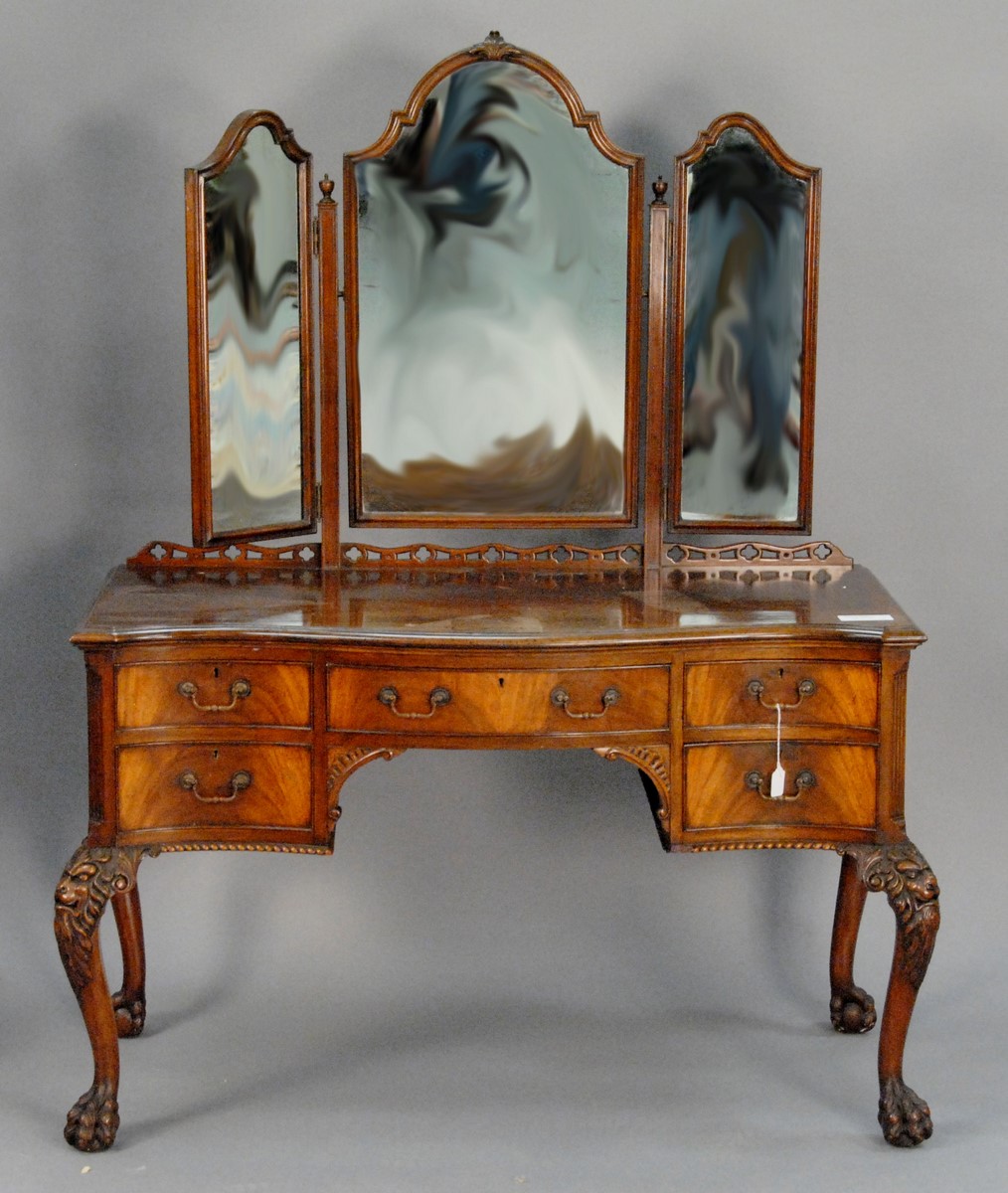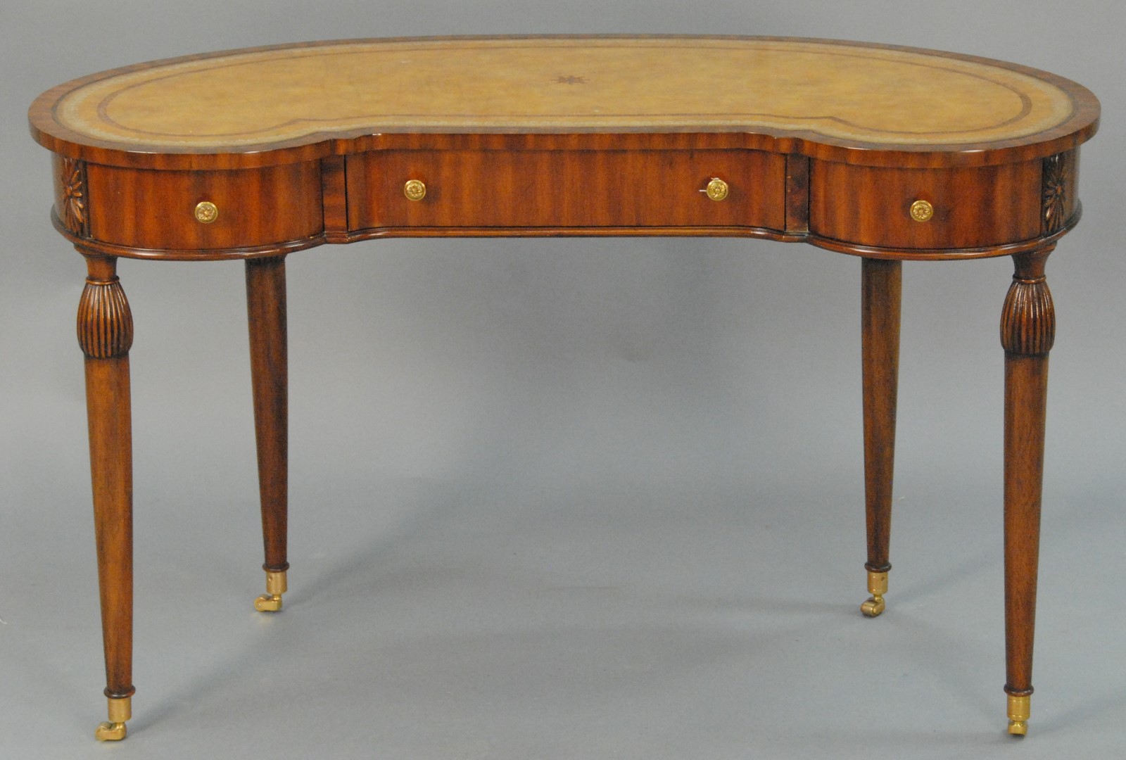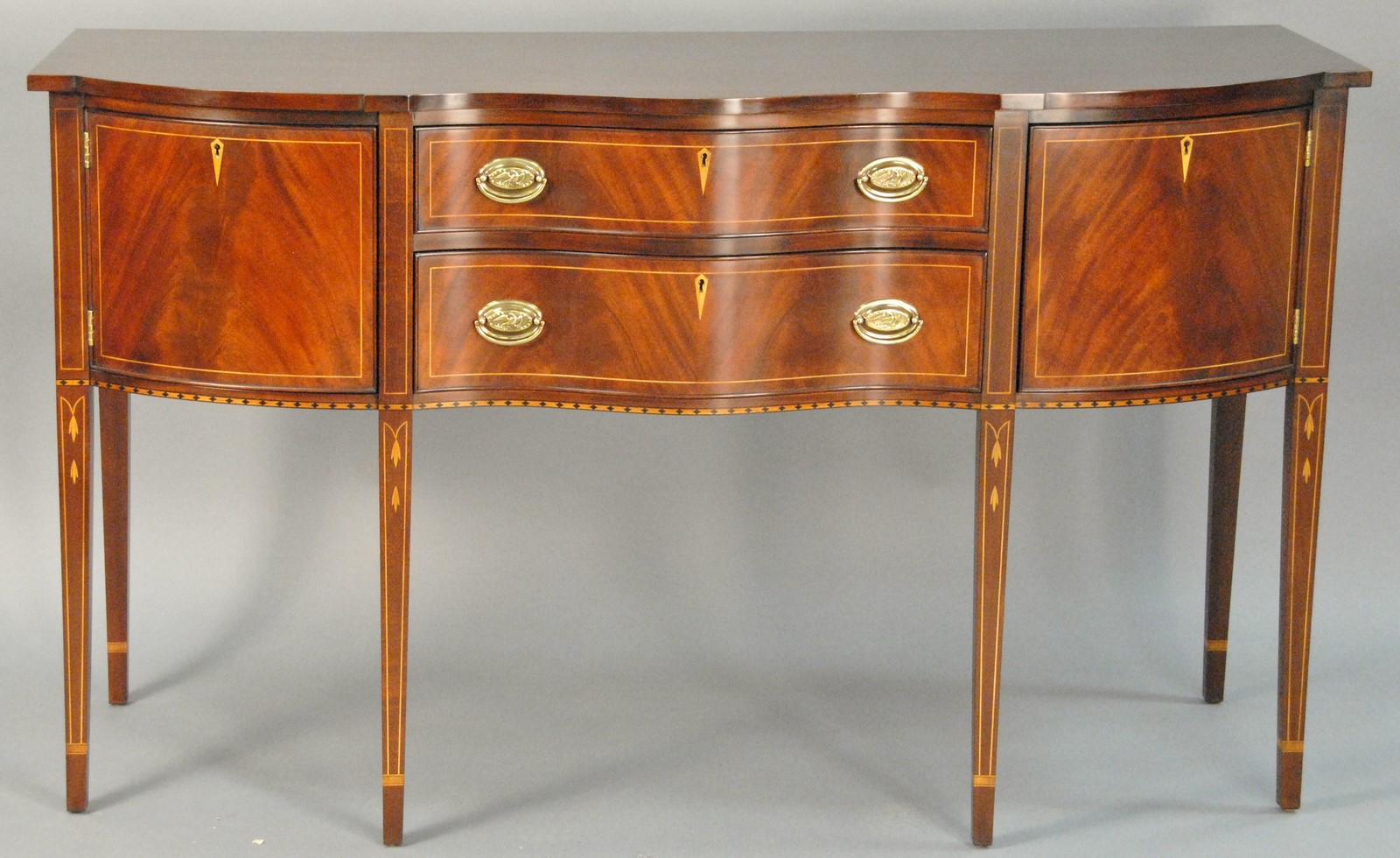 Henkel Harris Federal style mahogany sideboard having serpentine top over conforming case with two center drawers flanked by two doors all set on square tapered legs. ht. 38 1/2in., wd. 64 1/4in., dp. 18 in.
