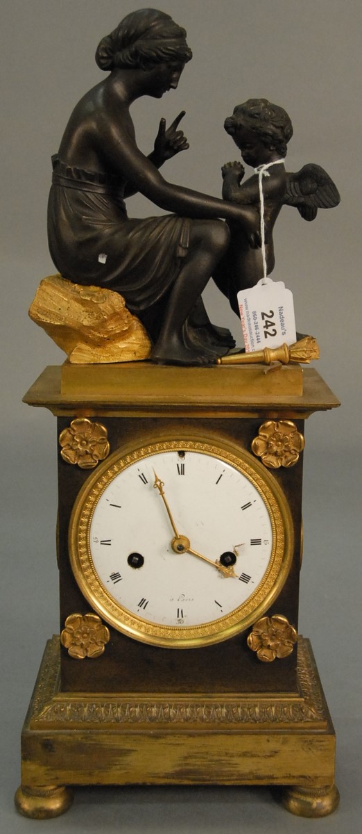 French bronze and gilt bronze shelf clock, mounted with bronze woman on gilt bronze rock with bronze putti, dial marked Paris. ht. 16 1/2 in. wd. 6 1/2 in.