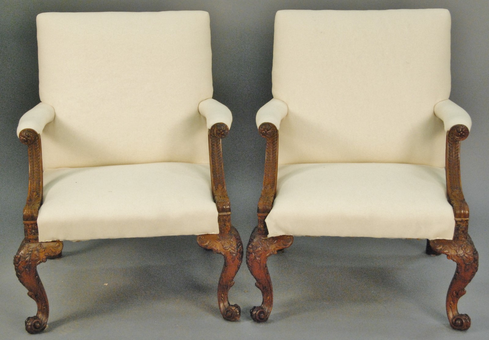 Pair of George II style chairs with upholstered backs and seats having intricately carved arm supports and legs ending in scrolled feet, now upholstered in muslin ready for new upholstery, signed H. Samuel, 484 Oxford St. London, 19th century.