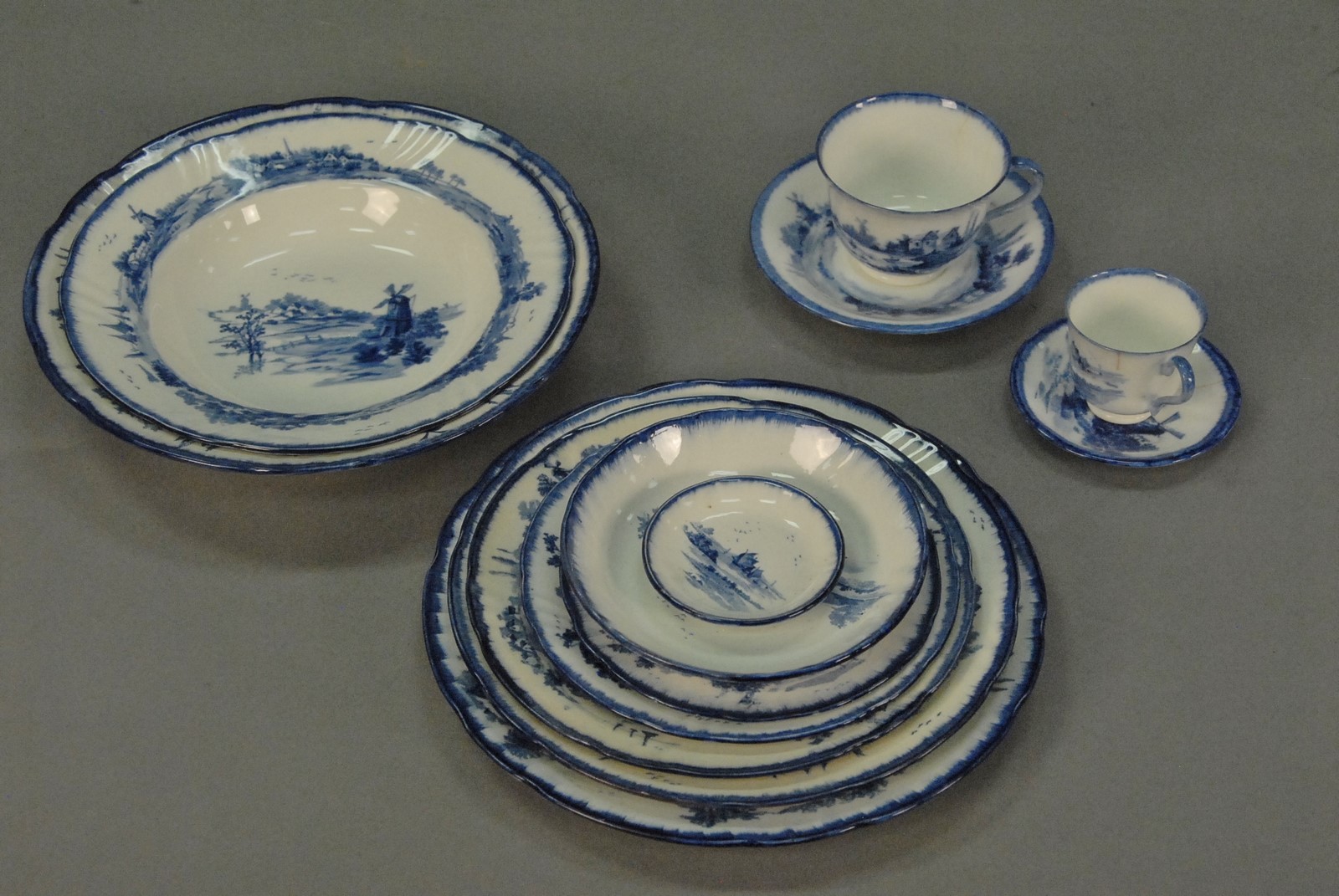Large assembled set of blue and white Doulton Burslem England Norfolk pattern 286 total pieces to include 142 various size plates, 12 platters, 14 small tea cups, 10 coffee cups, 11 salad bowls, 10 soup bowls, 7 small bowls, 12 berry bowls, 26 ramekins, 3 small covered serving dishes, 1 large covered serving dishes, 5 liners, 1 covered tureen, 16 big saucers, and 16 small saucers.