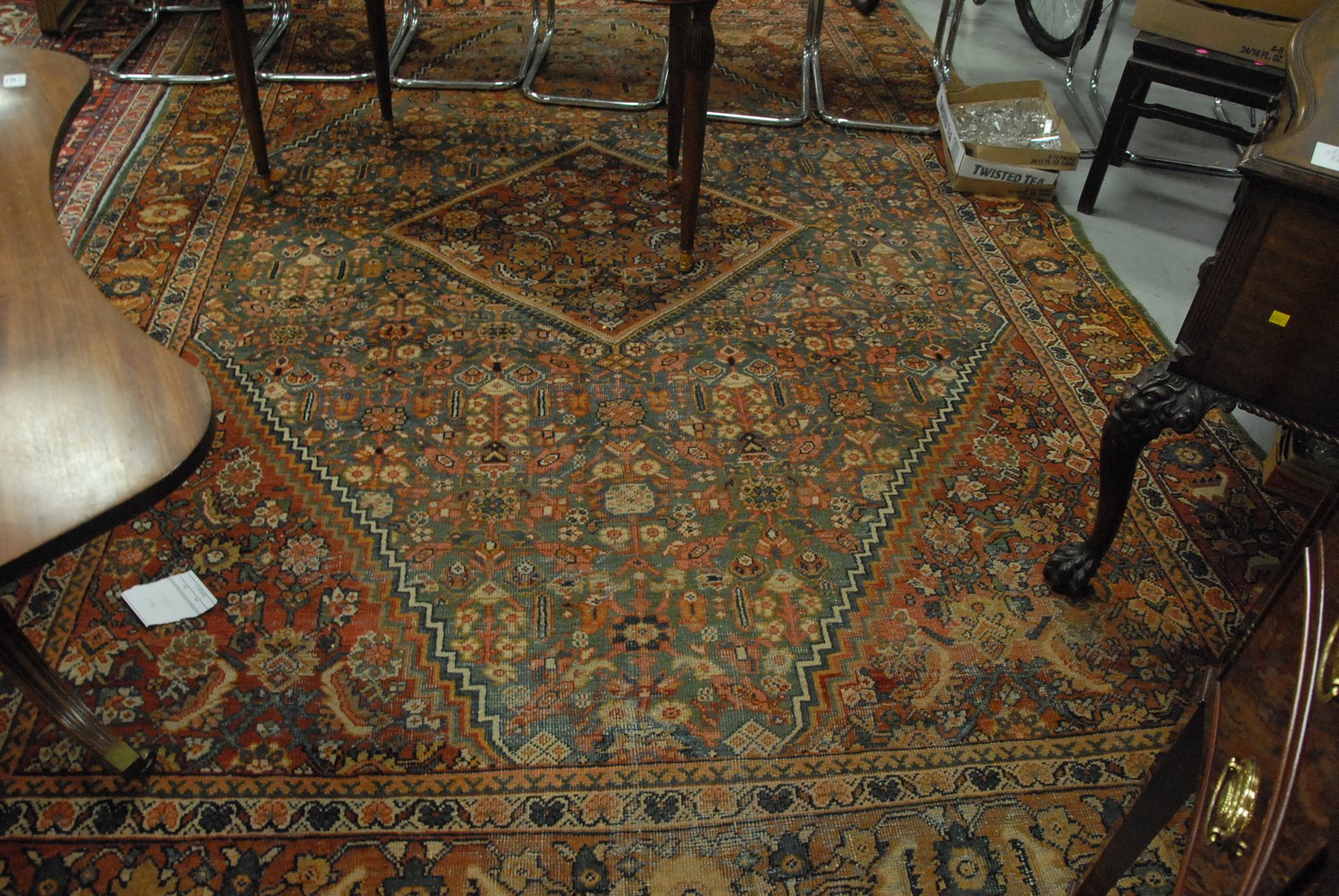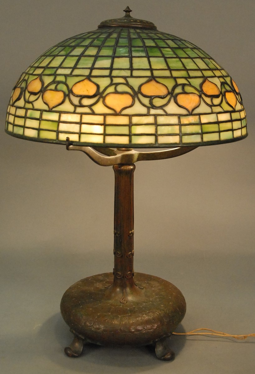 Tiffany Studios acorn table lamp having leaded glass shade with dark green and heavily mottled shade decorated with bands of green and yellow striated, acorns encircling the shade resting on a three socket, bronze Tiffany base that is decorated with bronze tendrils on the stem and a nubby cushion platform on four carved feet, base complete with riser wheel and pierced top cap, base marked Tiffany Studios New York . ht 23 in dia. 15 1/2 in.