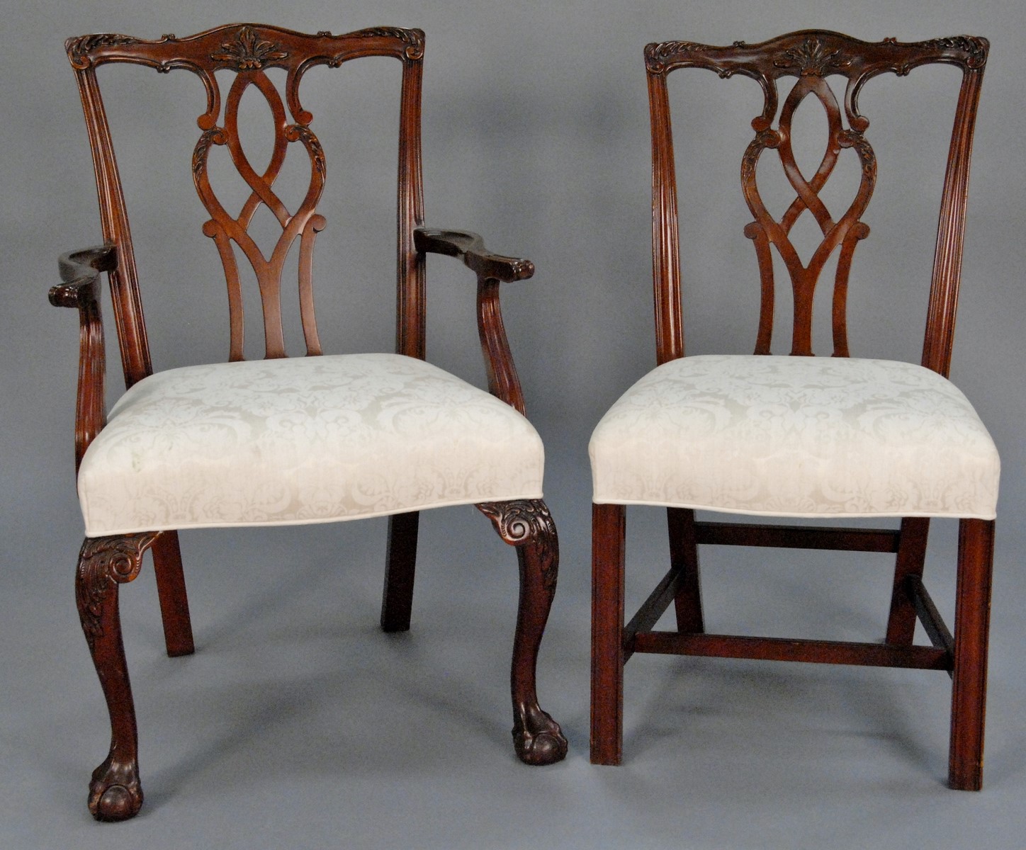 Set of twelve Kindel Chippendale style dining chairs with pierce carved backs over fully upholstered seats all set on molded square legs, two armchairs ending in ball and claw feet, signed with paper label on bottoms.