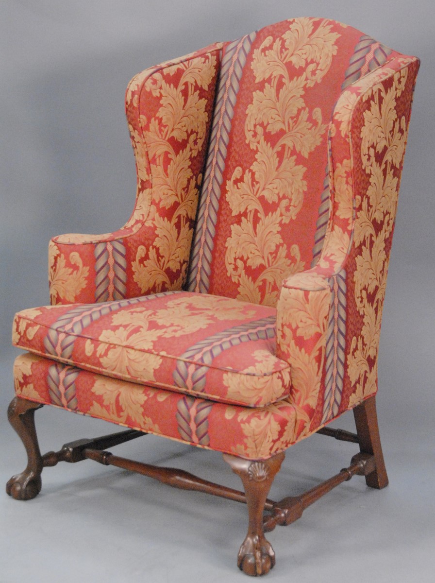 Kittinger Chippendale style upholstered wing chair with ball and claw feet and stretcher base, signed Kittinger Historic Newport. total ht. 49 1/2 in. wd. 36 in. dp. 25 1/2 in.