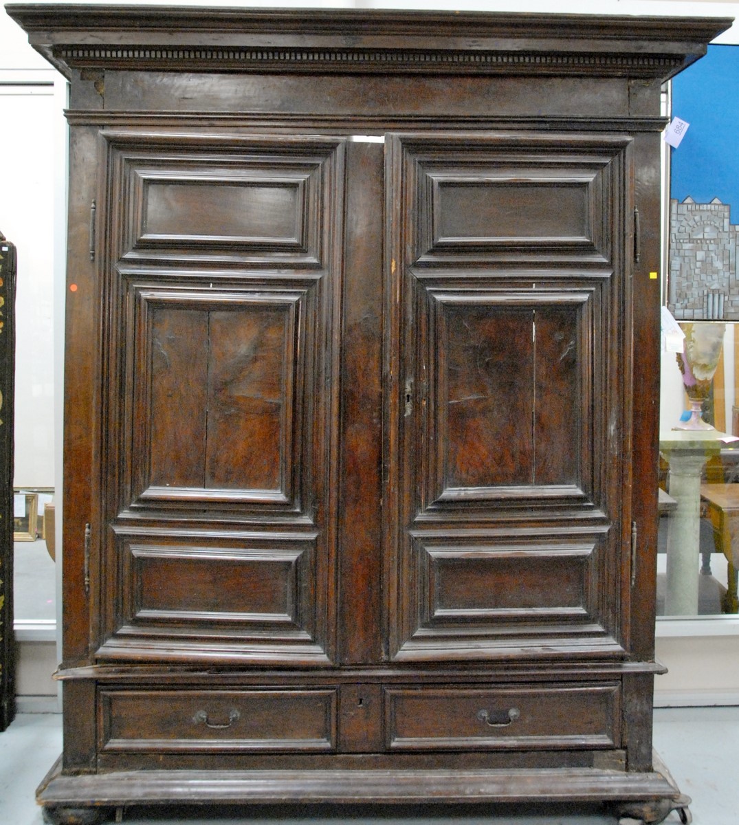 Dutch walnut Kas having large cornice molded top over two paneled doors over two drawers on molded base with suppressed ball feet, sides with raised panels, 17th/18th century some backboards replaced. ht. 90 in. wd. 69 1/2 in. plus molding dp. 24 in. Provenance: Property from The Estate of Margaret Oliphant of Old Lyme, Connecticut