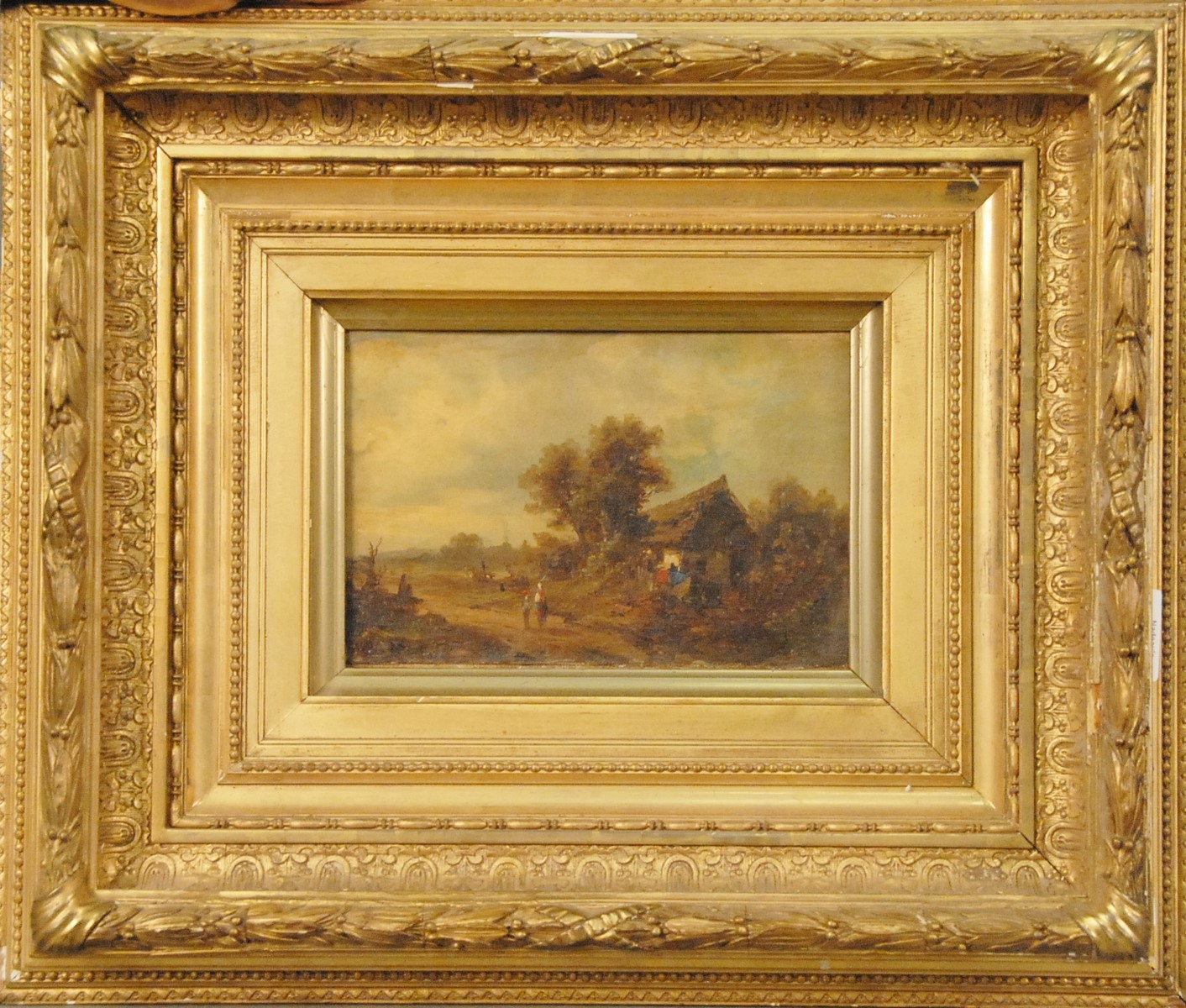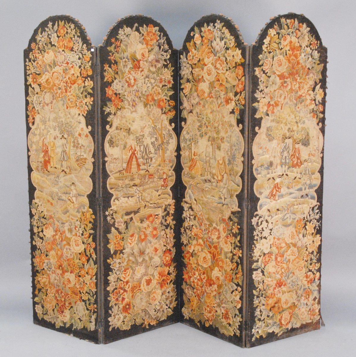 Four panel dressing screen, each panel with pettipoint, including romantic and fishing scenes having adults, children, sheep, horse, dogs, buildings, and flowers, reverse with hand painted paper, 19th century one panel with some damage. ht. 78 in. open wd. 96 in.