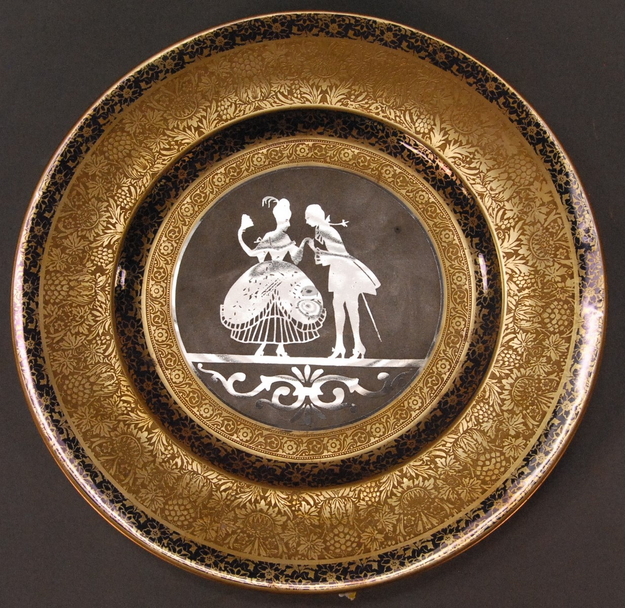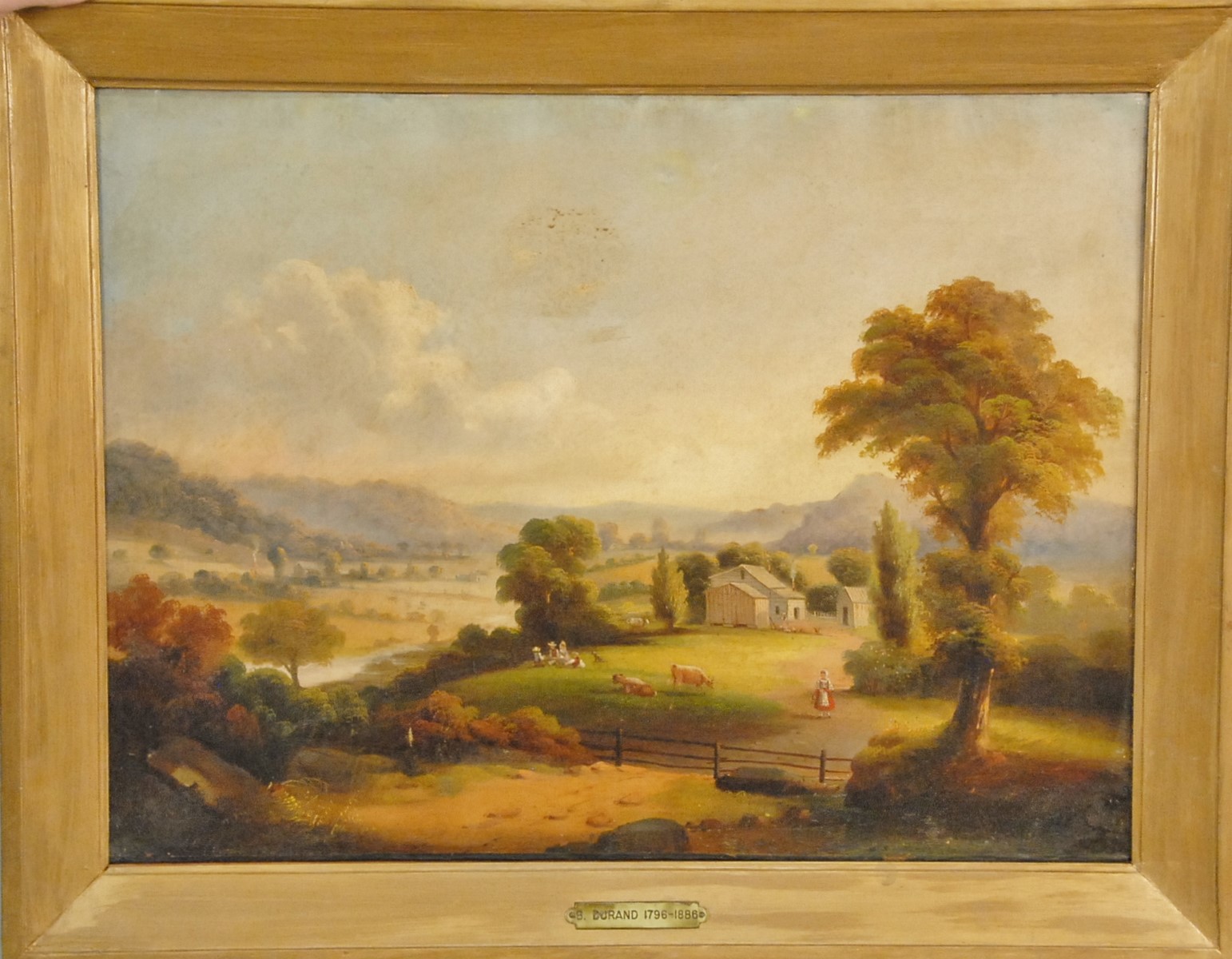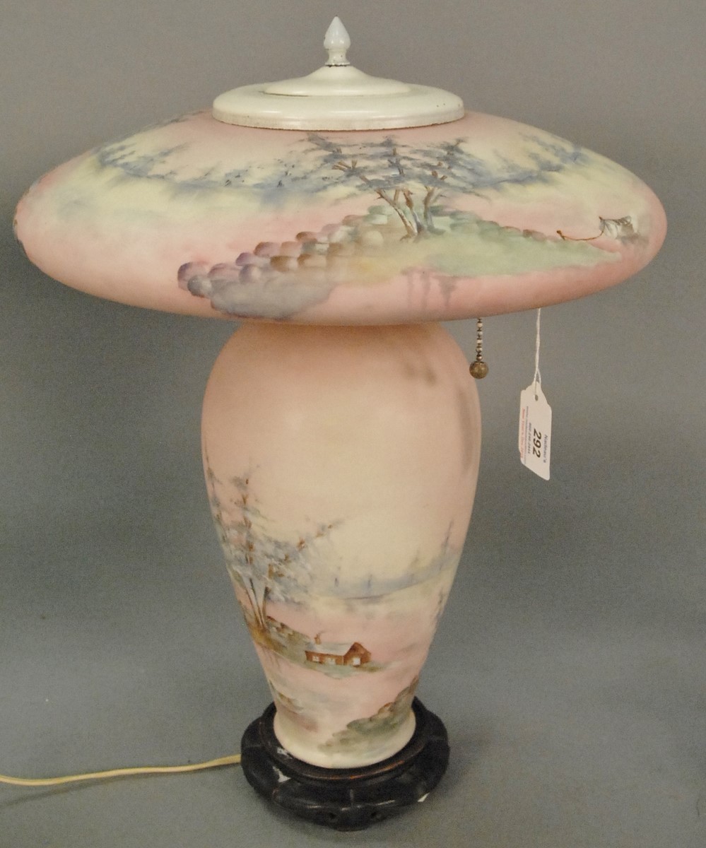 American Belleek scenic table lamp, hand painted with cabin and landscape with spruce trees, round tapered base and mushroom shade with two socket light. total ht. 13 in.