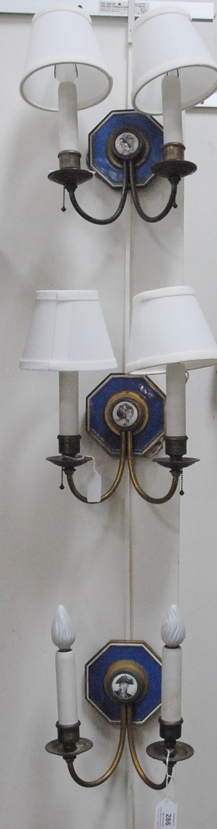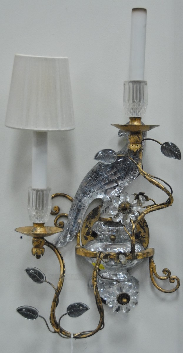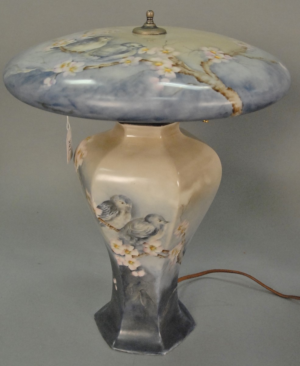 American Belleek blossom table lamp, hand painted with apple blossoms with three small birds perched on branch, the hexagon base is matching the shade decoration, shade is mushroom style with two light sockets. ht. 17 in.