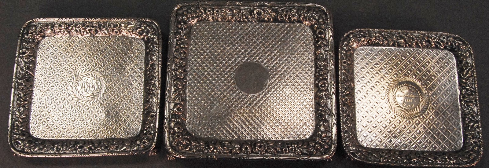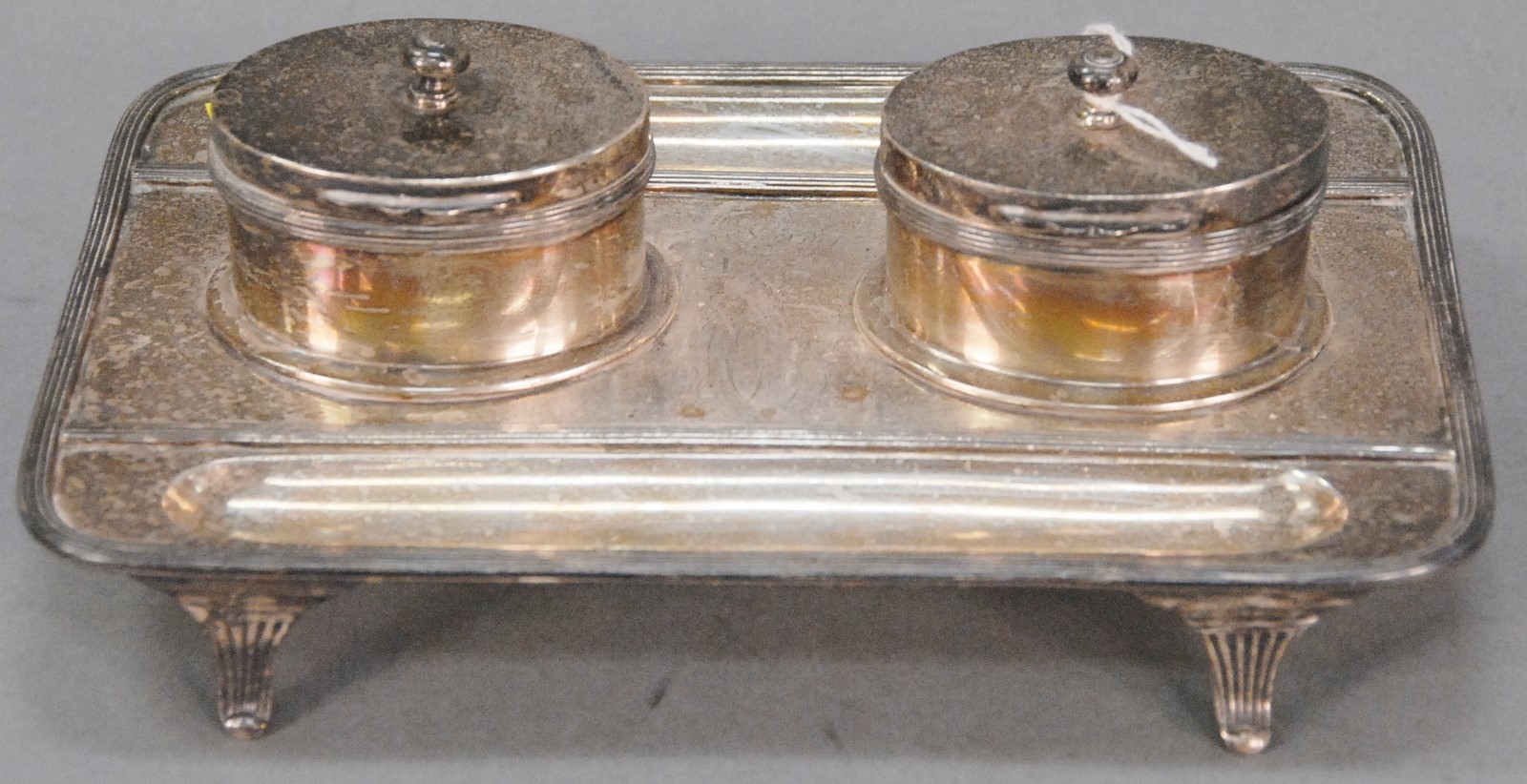 English silver desk set having two covered containers with original crystal inserts on pen tray, marked with monogram and Christmas 1892. 21 t oz. Provenance: Property from The Estate of Margaret Oliphant of Old Lyme, Connecticut