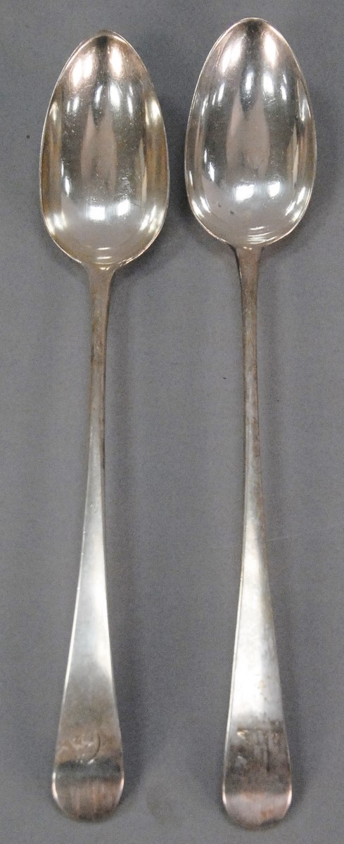 Two Hester Bateman silver stuffing spoons, one marked with C and one with coat of arms. lg. 11 1/2 in. 8.4 total t oz. Provenance: Property from The Estate of Margaret Oliphant of Old Lyme, Connecticut
