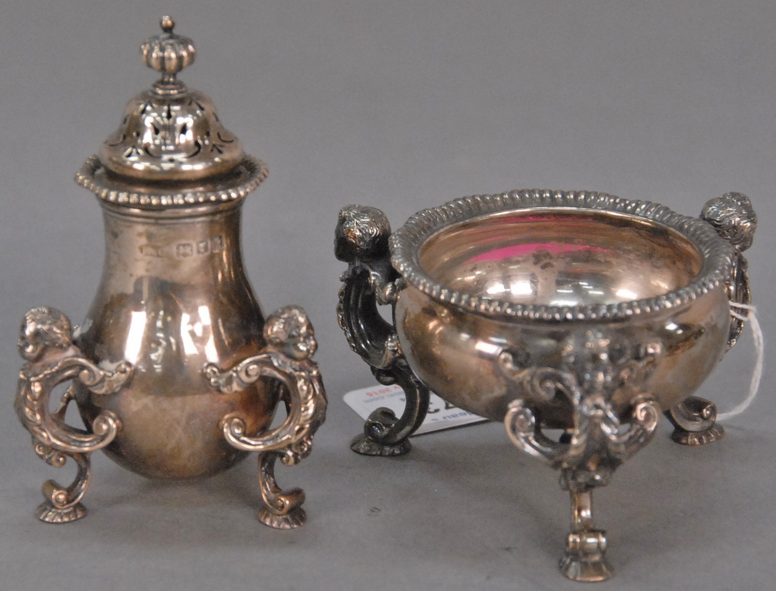 Creighton English silver open salt and pepper shaker, each mounted with putti head and hoof feet. shaker: ht. 4 1/4 in. 14.5 total t oz. Provenance: Property from The Estate of Margaret Oliphant of Old Lyme, Connecticut