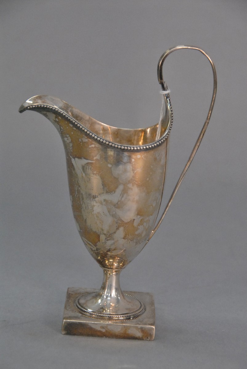 Hester Bateman silver creamer, urn style with tall handle, all on square base. ht. 6 1/4 in. Provenance: Property from The Estate of Margaret Oliphant of Old Lyme, Connecticut