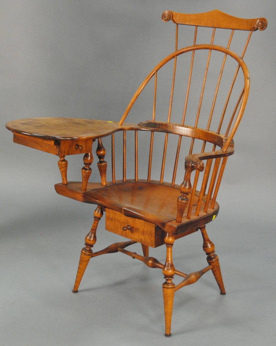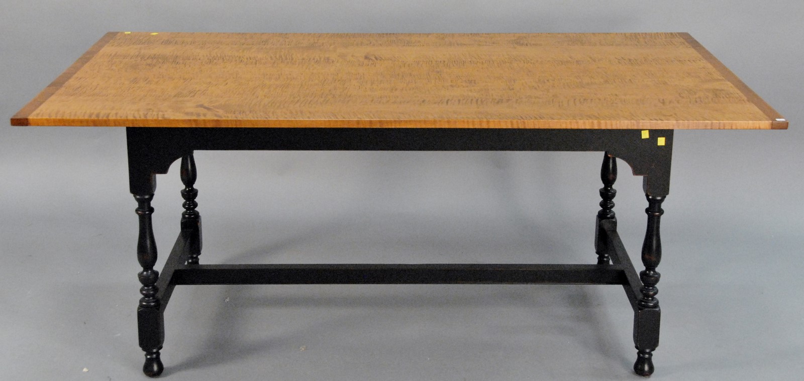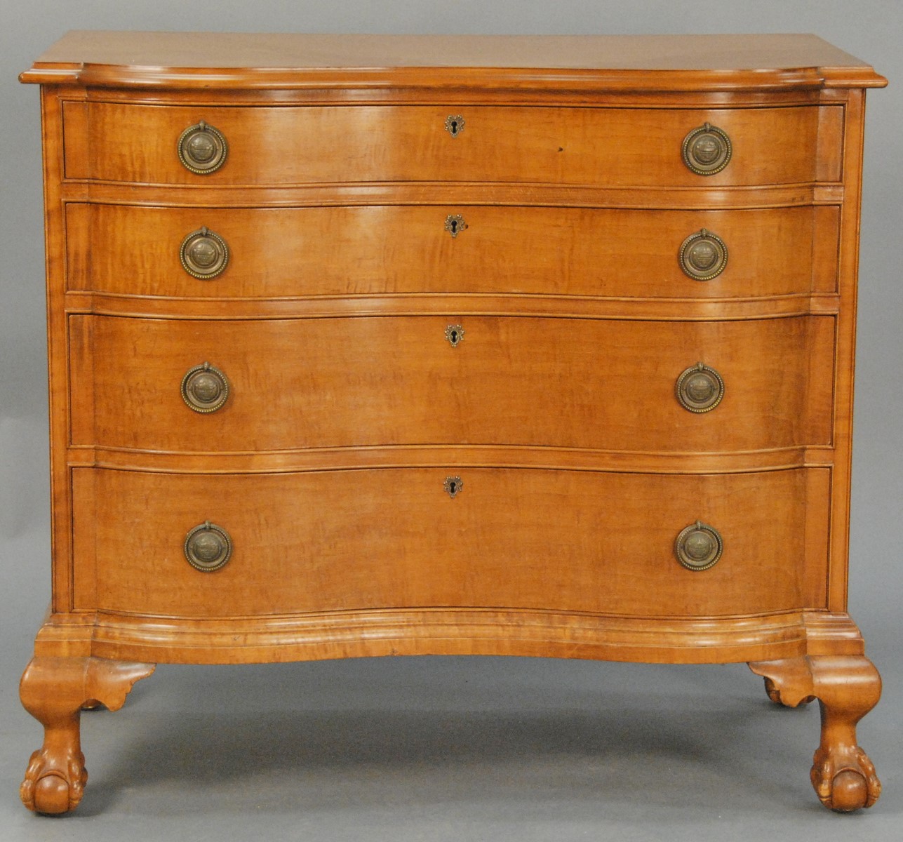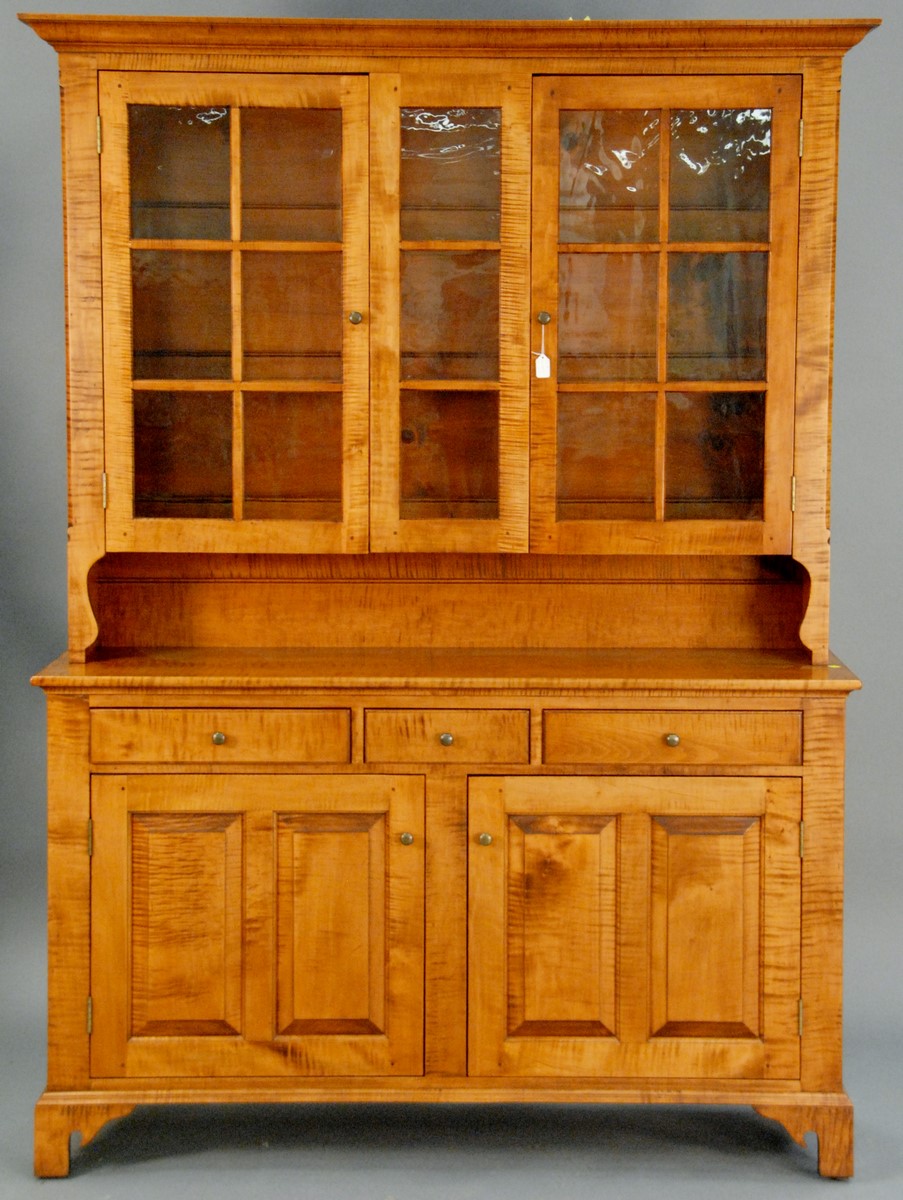 D.R. Dimes figured maple hutch in two parts, upper section with two glass doors and glass center panel, lower section having three drawers over two doors on bracket base, signed on back D.R. Dimes. ht. 83 in., wd. 57 1/2in., dp. 16 1/4in.