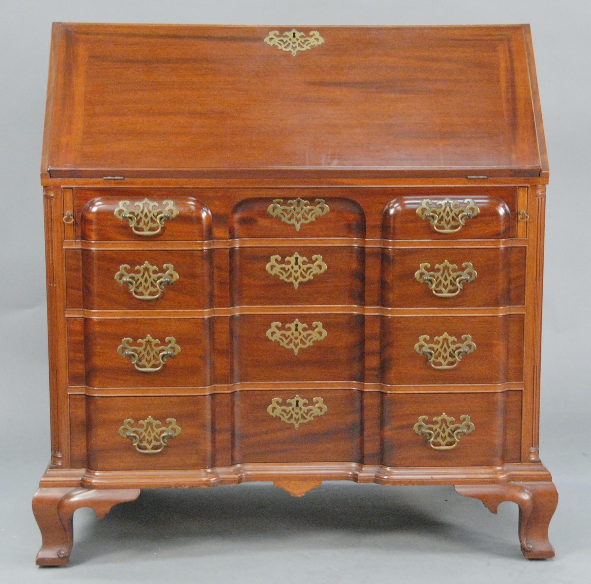 Margolis mahogany desk having slant lid over four block front drawers flanked by stop fluted quarter columns set on ogee feet, interior with shell carved door and drawers, sides with large brass handles, signed on back Margolis 1930. ht. 43 in. wd. 39 1/2 in. dp. 21 1/2 in.
