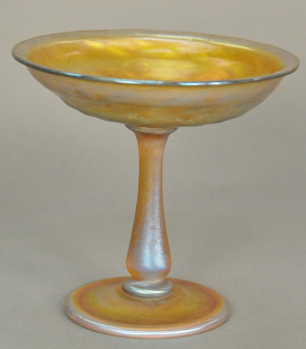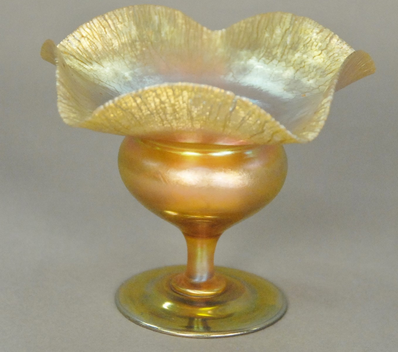 Tiffany gold Favrile glass compote with ruffled top and bulbous bowl on stem with round base, inscribed on bottom L.C. Tiffany Favrile 2812H. ht. 4 1/2 in. dia. 5 1/4 in.