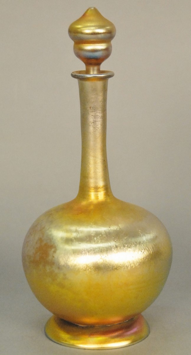 Tiffany gold iridescent Favrile glass decanter with stopper fitting the elongated neck of the conforming decanter flowing to the bulbous base, marked L.C. Tiffany Favrile 193, stopper marked 193. ht. 10 in.