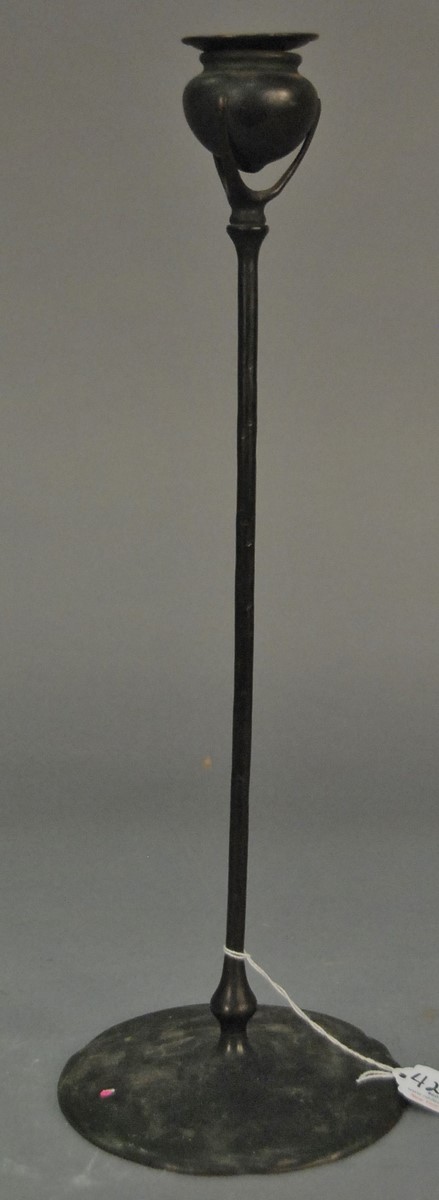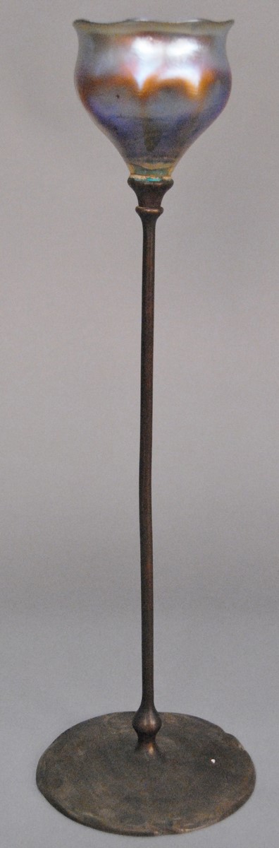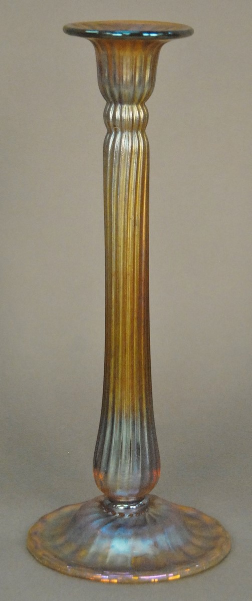 Tiffany gold iridescent Favrile glass candlestick with flared top and ribbed stem set on round ribbed base, inscribed on bottom L.C. Tiffany Favrile 5. ht. 12 in.